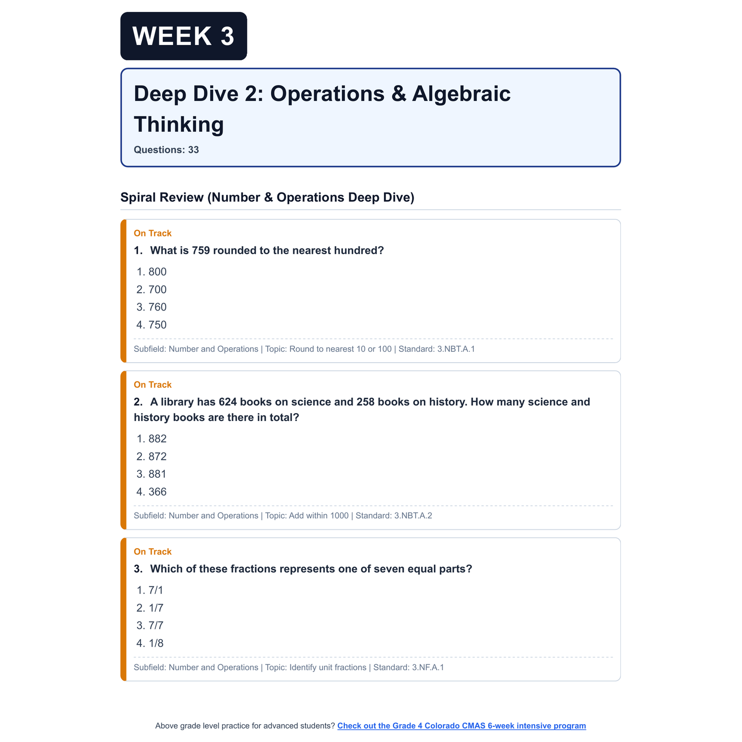 - 4 Targeted Domain Deep Dives: Each week focuses on one of the four test domains (Number | Algebra | Measurement, Data, and Statistics | Geometry). Each deep dive includes: targeted domain questions, a spiral review of previous weeks to ensure learned topics aren't forgotten, and clear question categorization by Scale Score and Common Core/Colorado Math Standards (CAS)
