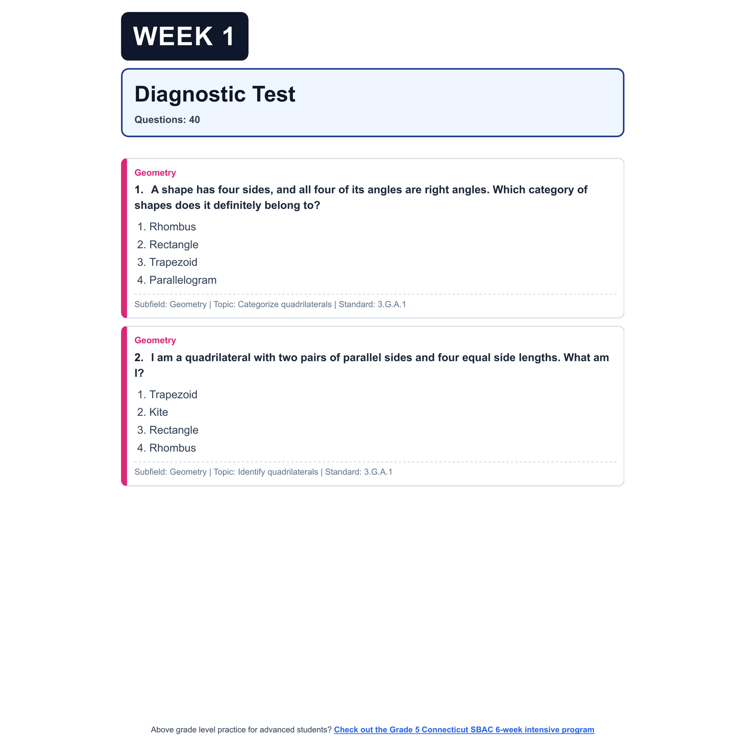 - Diagnostic Assessment: A full simulation of the real Connecticut SBAC. This sets a baseline, highlights gaps, and will be used later to show growth