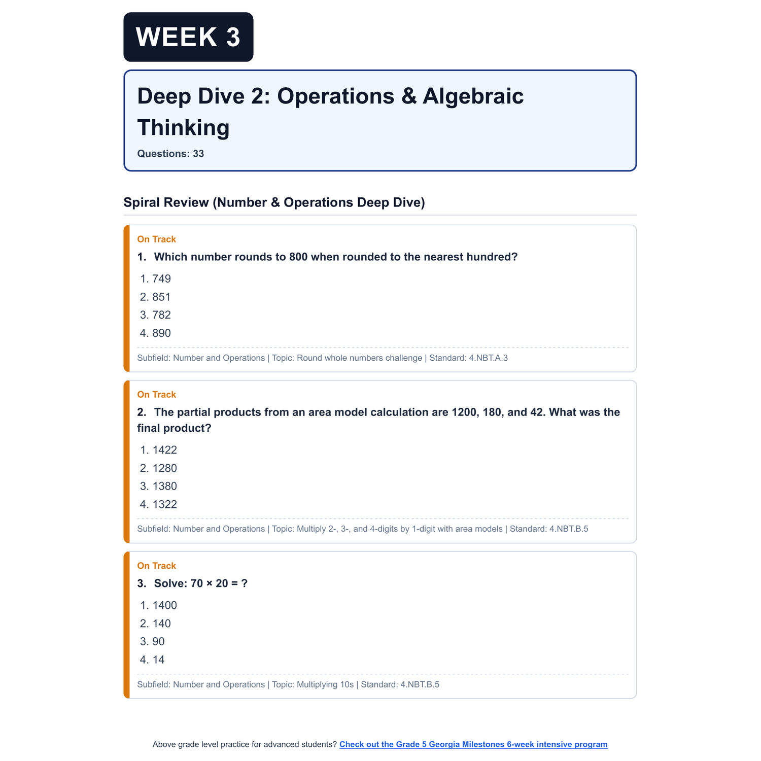 - 4 Targeted Domain Deep Dives: Each week focuses on one of the four test domains (Number | Algebra | Measurement, Data, and Statistics | Geometry). Each deep dive includes: targeted domain questions, a spiral review of previous weeks to ensure learned topics aren't forgotten, and clear question categorization by Scale Score and Common Core/Georgia Standards of Excellence (GSE)