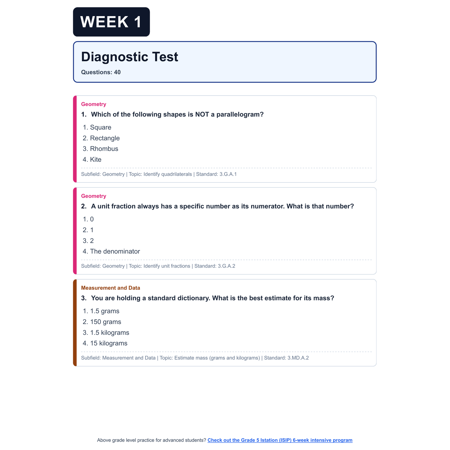 - 4 Targeted Domain Deep Dives: Each week focuses on one of the four test domains (Number | Algebra | Measurement, Data, and Statistics | Geometry). Each deep dive includes: targeted domain questions, a spiral review of previous weeks to ensure learned topics aren't forgotten, and clear question categorization by Scale Score and Common Core State Standards (CCSS)