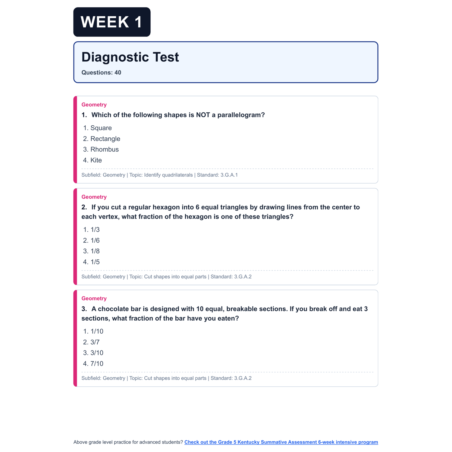 - Diagnostic Assessment: A full simulation of the real Kentucky Summative Assessment. This sets a baseline, highlights gaps, and will be used later to show growth