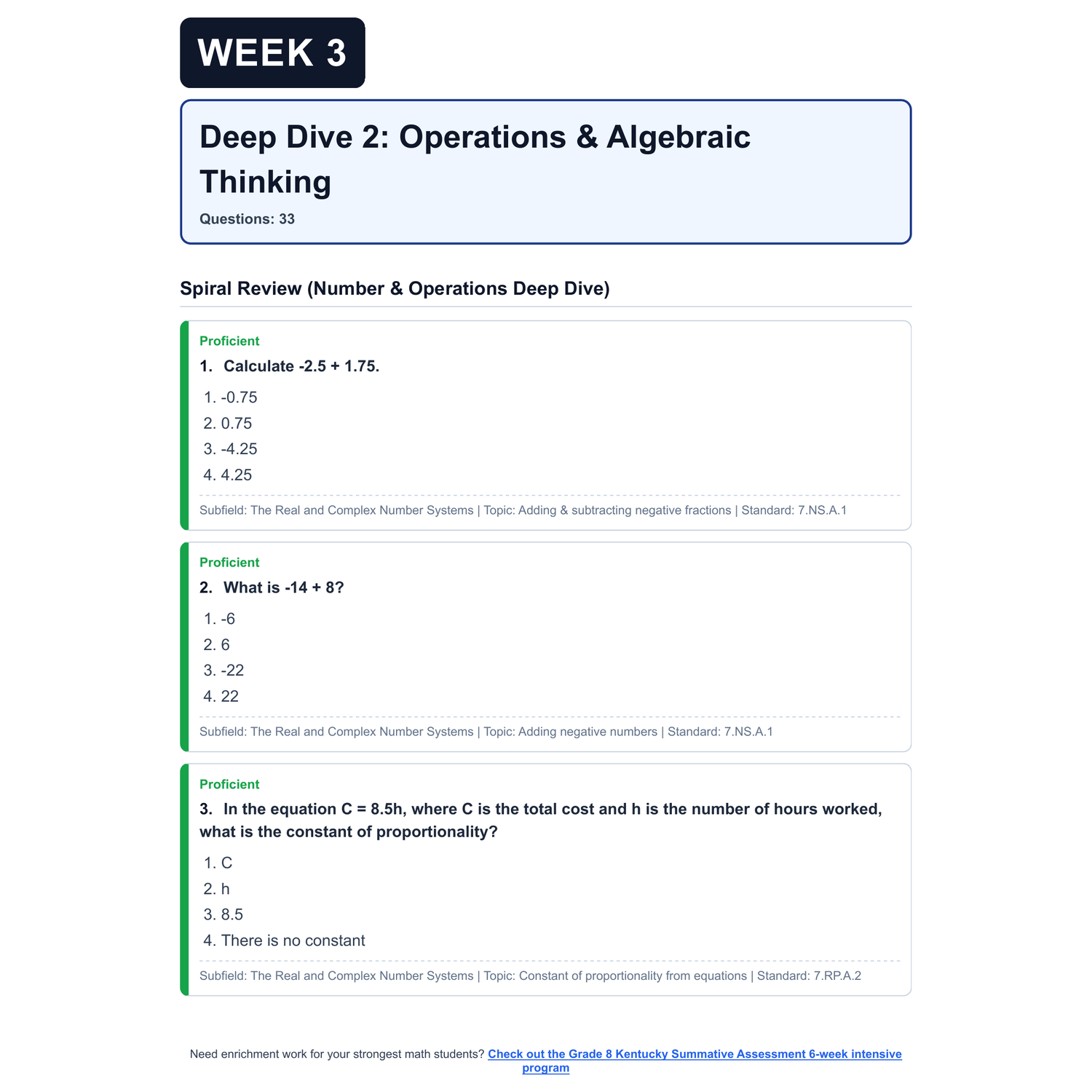 - 4 Targeted Domain Deep Dives: Each week focuses on one of the four test domains (Number | Algebra | Measurement, Data, and Statistics | Geometry). Each deep dive includes: targeted domain questions, a spiral review of previous weeks to ensure learned topics aren't forgotten, and clear question categorization by Scale Score and Common Core/Kentucky Math Standards (KAS)