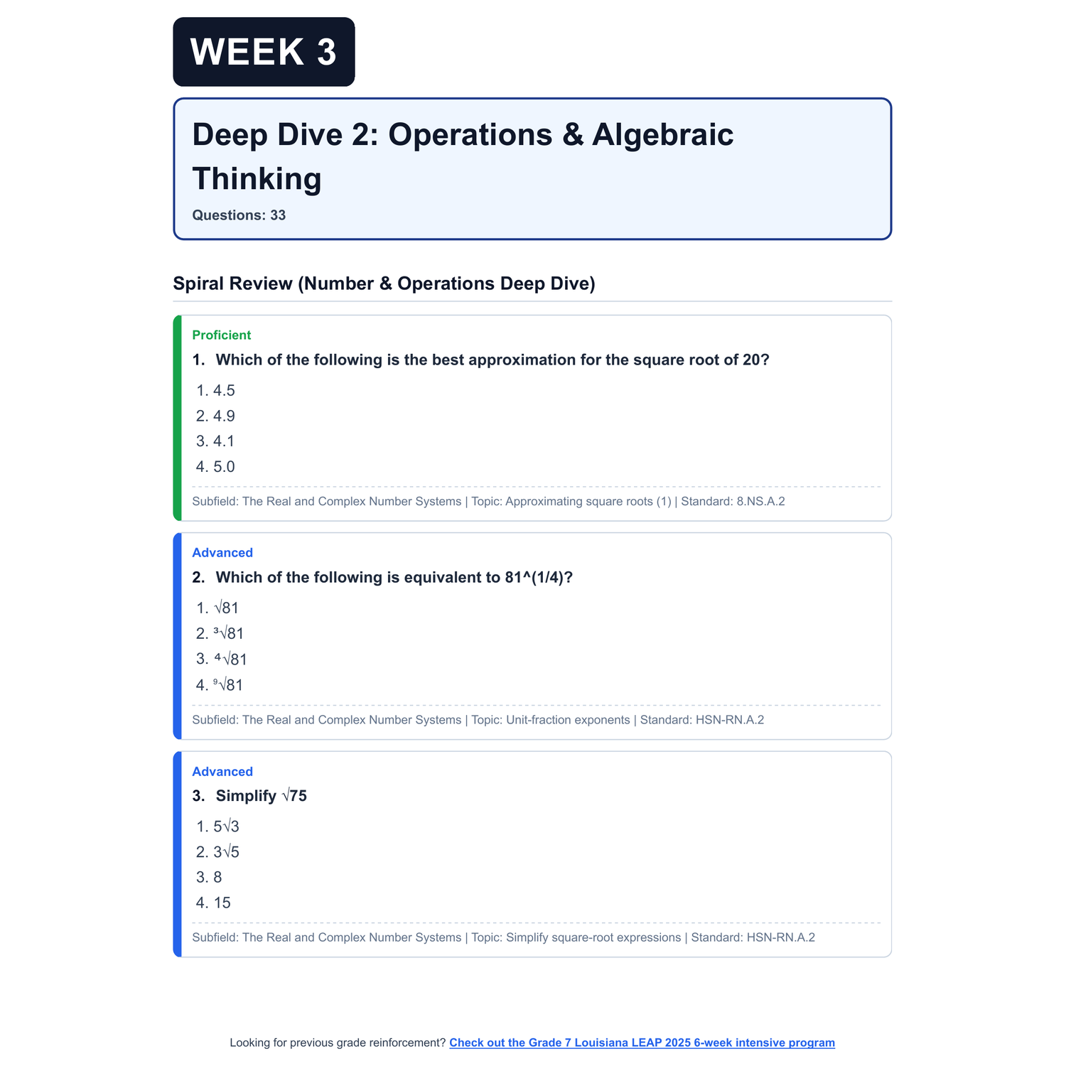 - 4 Targeted Domain Deep Dives: Each week focuses on one of the four test domains (Number | Algebra | Measurement, Data, and Statistics | Geometry). Each deep dive includes: targeted domain questions, a spiral review of previous weeks to ensure learned topics aren't forgotten, and clear question categorization by Scaled Score and Common Core/Louisiana Math Standards (LSS)