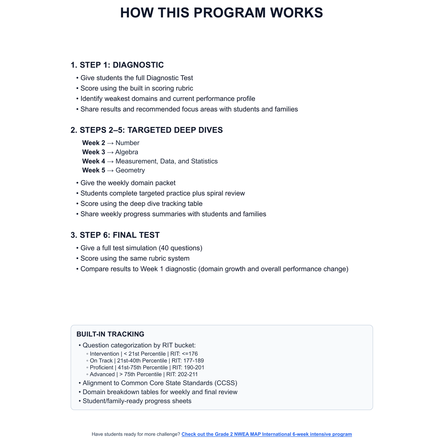 - 4 Targeted Domain Deep Dives: Each week focuses on one of the four test domains (Number | Algebra | Measurement, Data, and Statistics | Geometry). Each deep dive includes: targeted domain questions, a spiral review of previous weeks to ensure learned topics aren't forgotten, and clear question categorization by RIT and Common Core State Standards (CCSS)