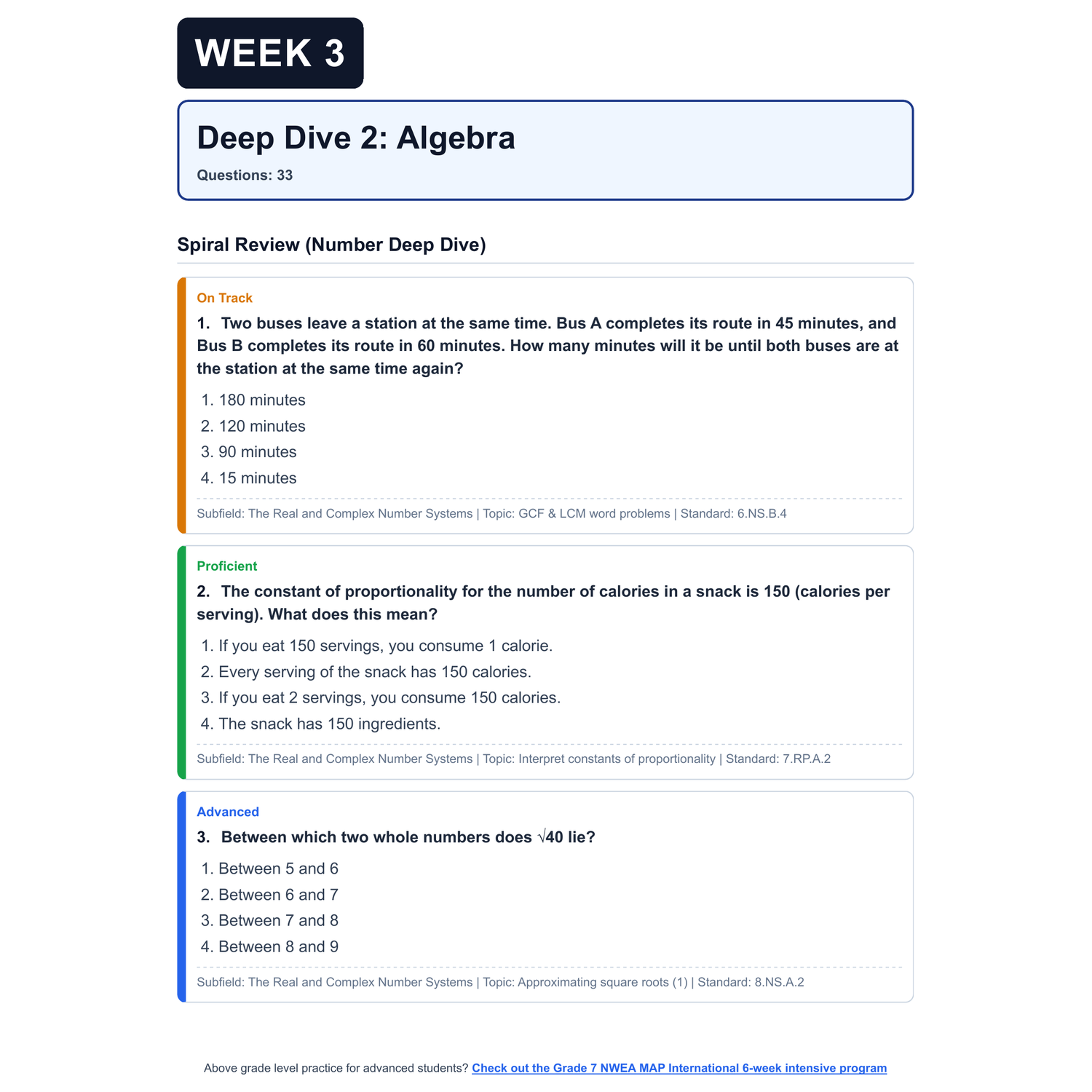 - 4 Targeted Domain Deep Dives: Each week focuses on one of the four test domains (Number | Algebra | Measurement, Data, and Statistics | Geometry). Each deep dive includes: targeted domain questions, a spiral review of previous weeks to ensure learned topics aren't forgotten, and clear question categorization by RIT and Common Core State Standards (CCSS)