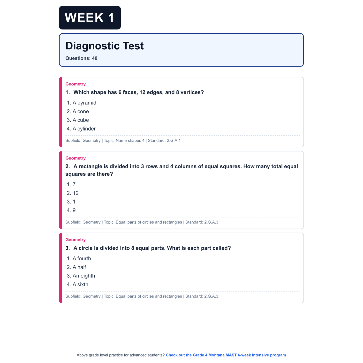 - Diagnostic Assessment: A full simulation of the real Montana MAST. This sets a baseline, highlights gaps, and will be used later to show growth