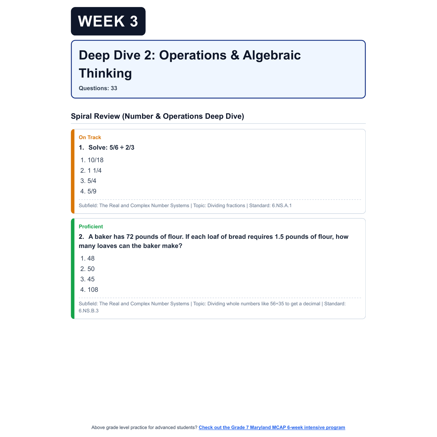 - 4 Targeted Domain Deep Dives: Each week focuses on one of the four test domains (Number | Algebra | Measurement, Data, and Statistics | Geometry). Each deep dive includes: targeted domain questions, a spiral review of previous weeks to ensure learned topics aren't forgotten, and clear question categorization by Scale Score and Common Core/Maryland College and Career-Ready Standards (MCCRS)