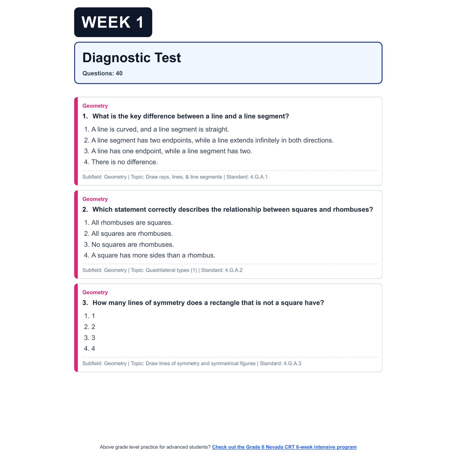 - Diagnostic Assessment: A full simulation of the real Nevada CRT. This sets a baseline, highlights gaps, and will be used later to show growth