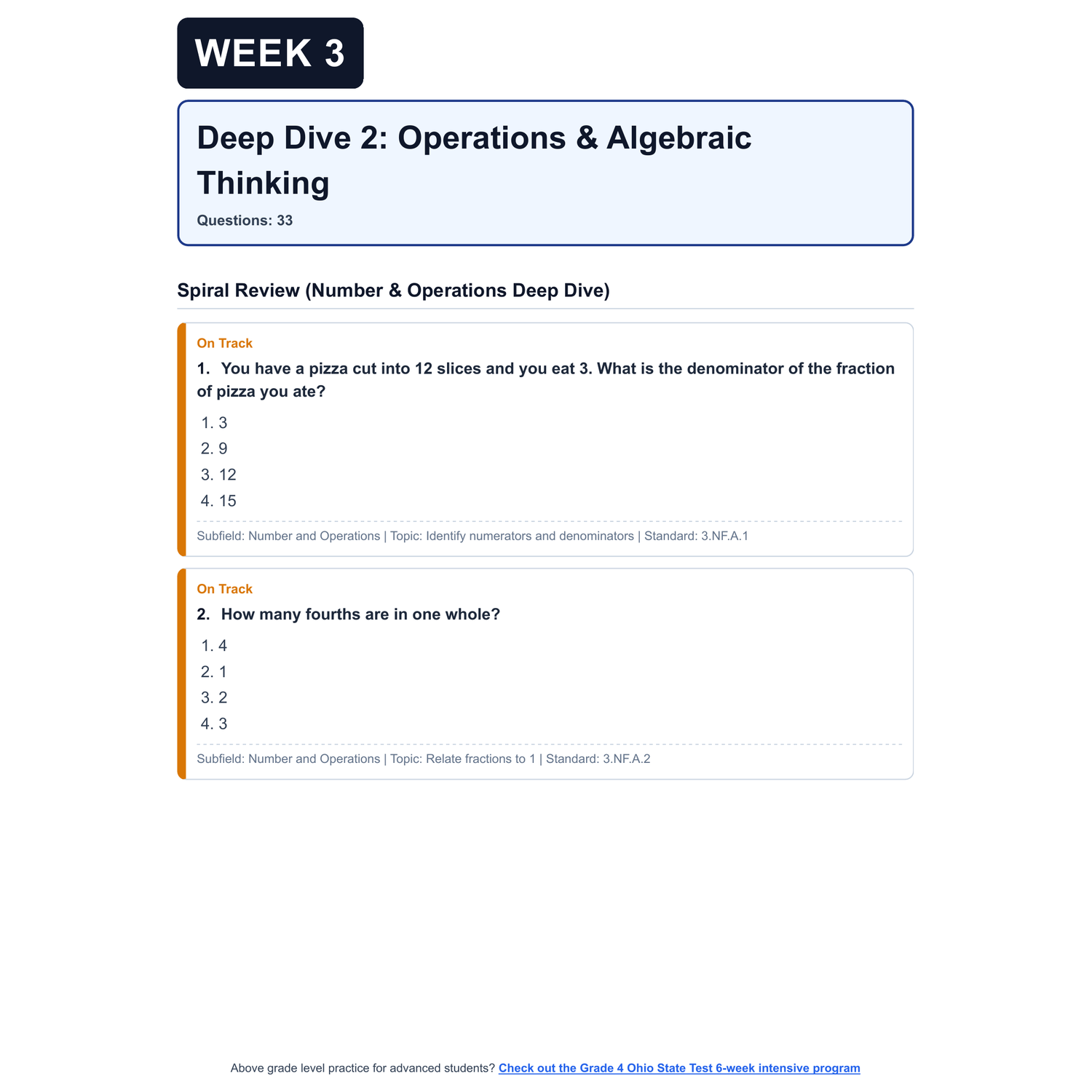 - 4 Targeted Domain Deep Dives: Each week focuses on one of the four test domains (Number | Algebra | Measurement, Data, and Statistics | Geometry). Each deep dive includes: targeted domain questions, a spiral review of previous weeks to ensure learned topics aren't forgotten, and clear question categorization by Scaled Score and Common Core/Ohio's Learning Standards