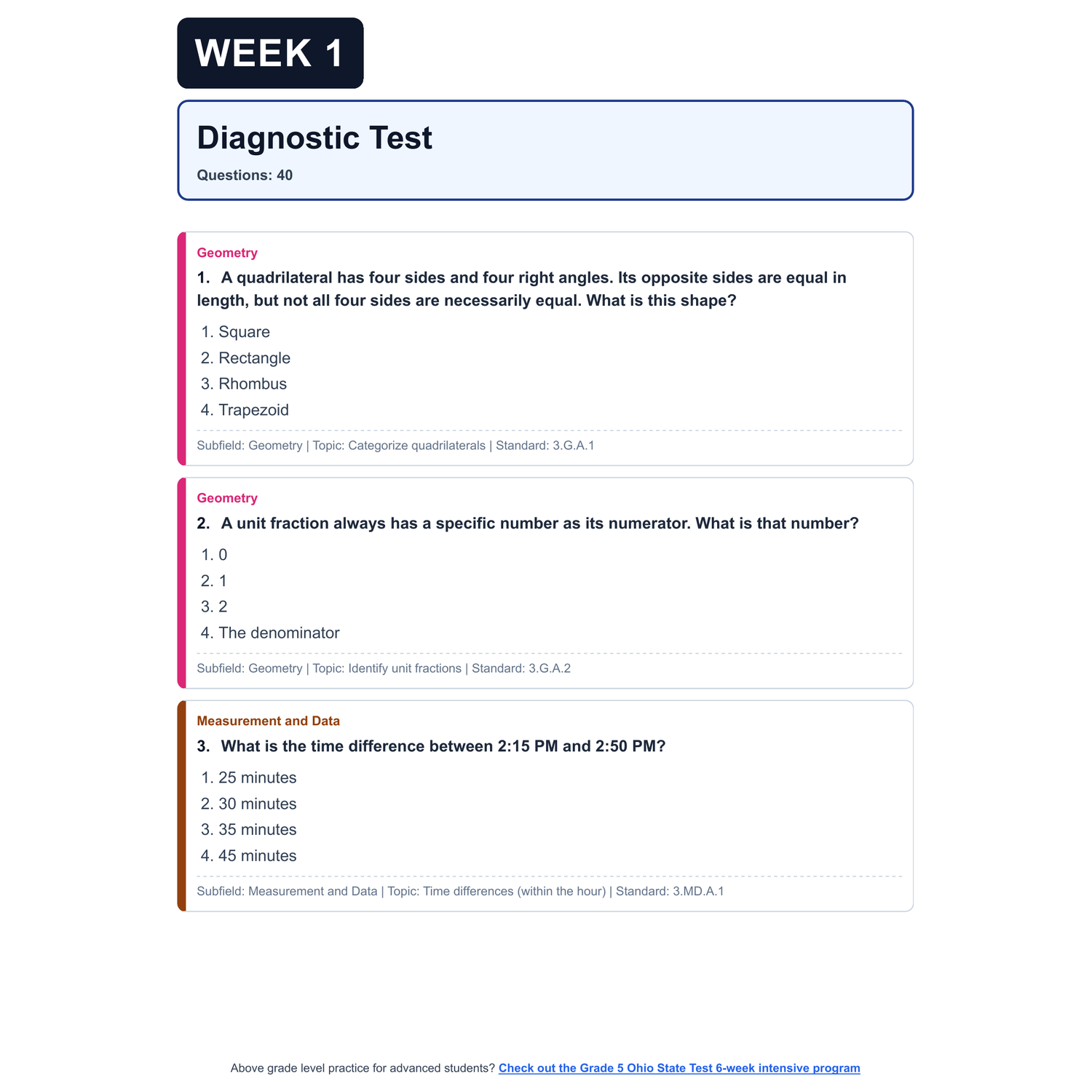 - Diagnostic Assessment: A full simulation of the real Ohio State Test. This sets a baseline, highlights gaps, and will be used later to show growth