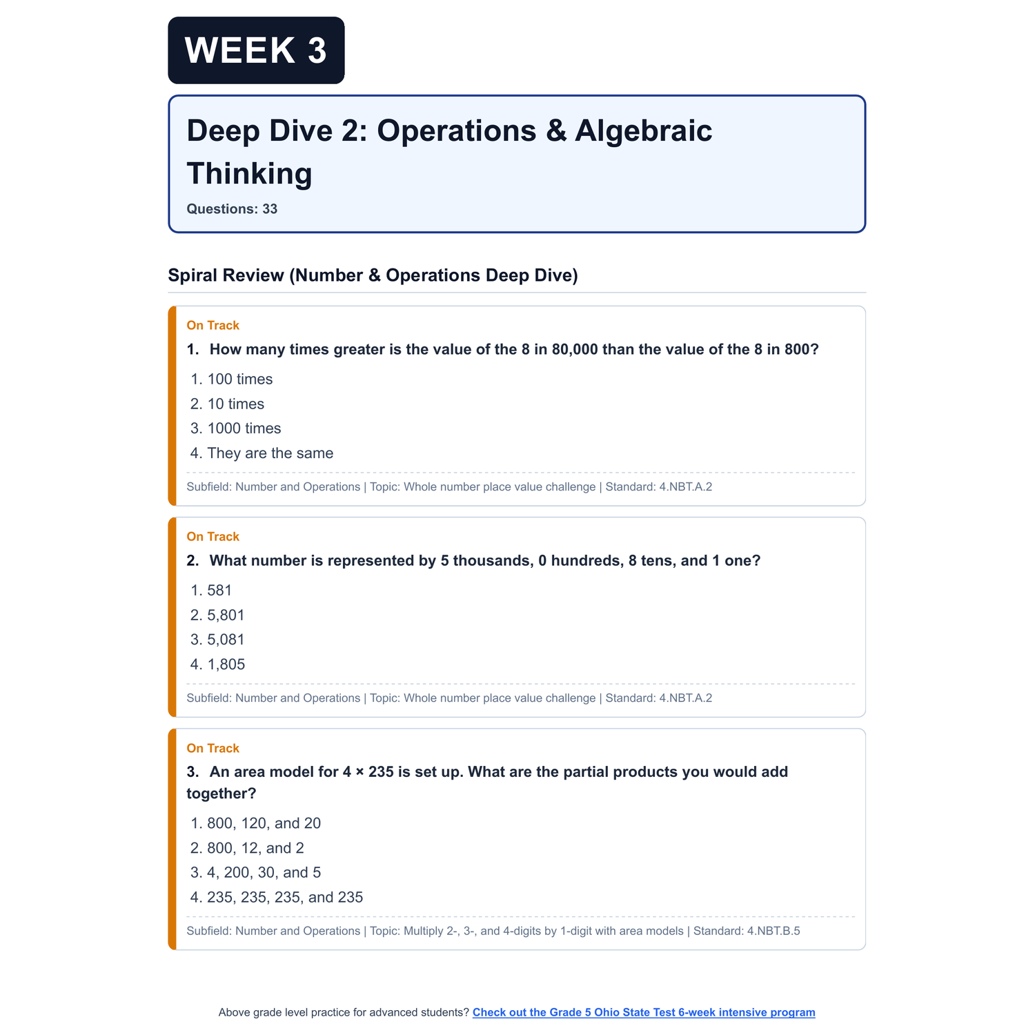 - 4 Targeted Domain Deep Dives: Each week focuses on one of the four test domains (Number | Algebra | Measurement, Data, and Statistics | Geometry). Each deep dive includes: targeted domain questions, a spiral review of previous weeks to ensure learned topics aren't forgotten, and clear question categorization by Scaled Score and Common Core/Ohio's Learning Standards