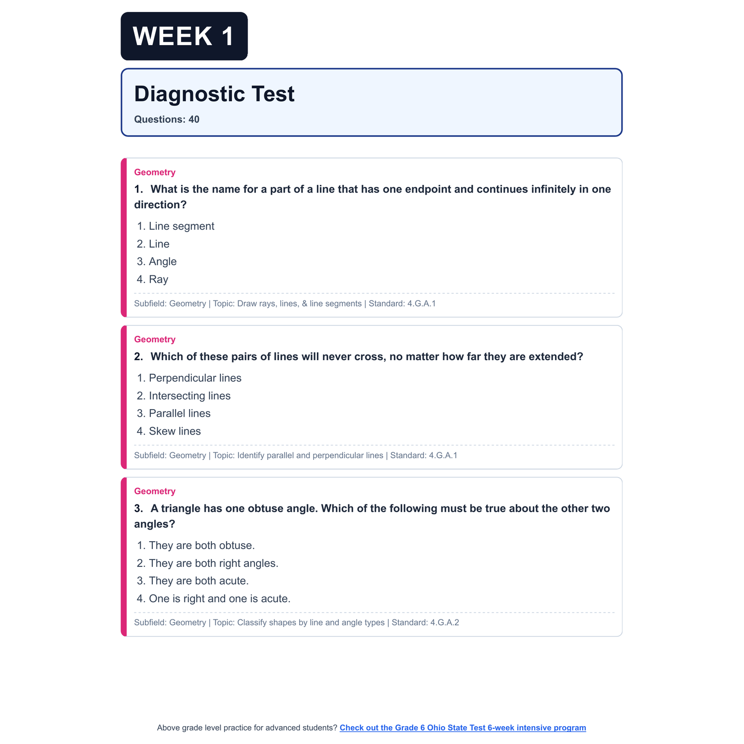 - Diagnostic Assessment: A full simulation of the real Ohio State Test. This sets a baseline, highlights gaps, and will be used later to show growth