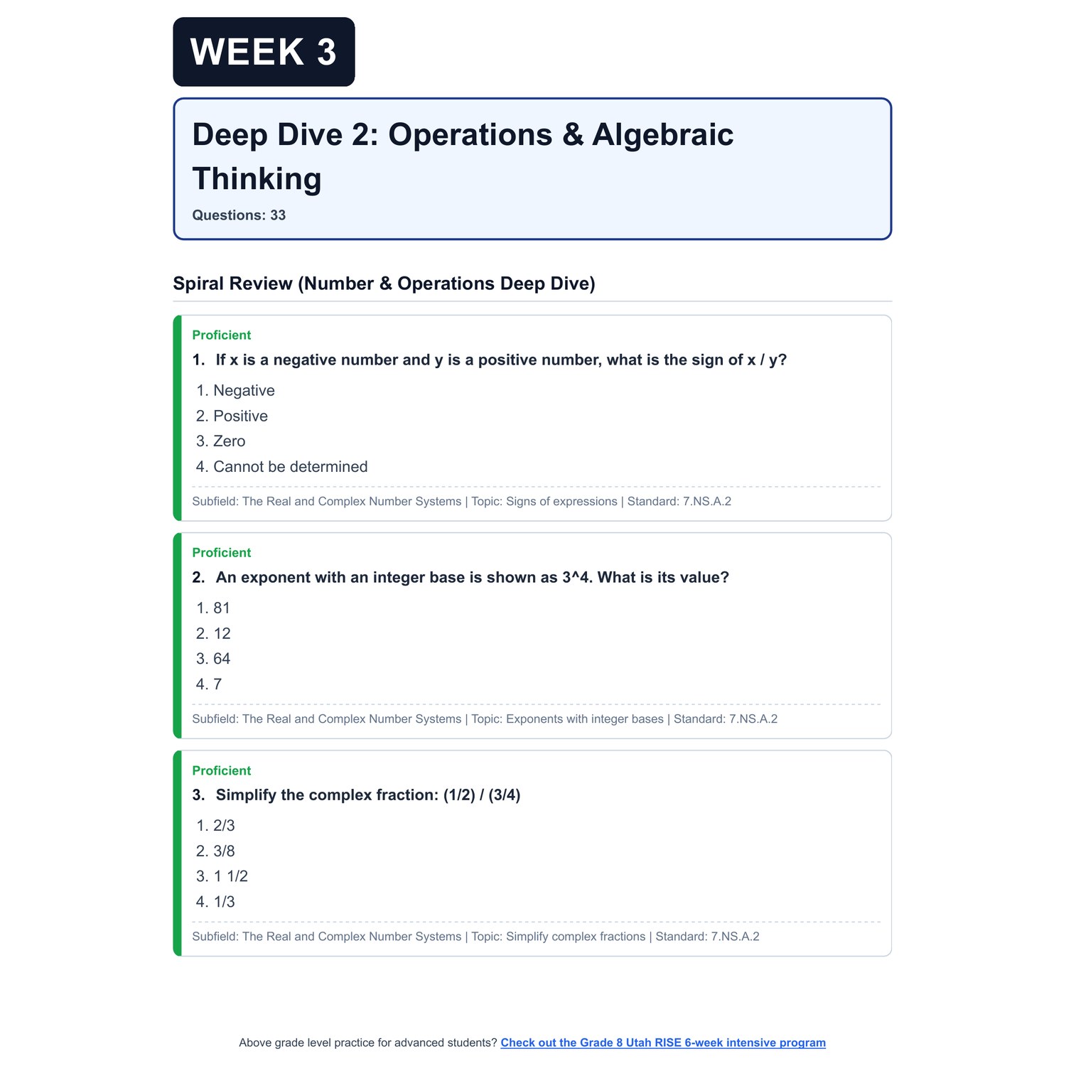 - 4 Targeted Domain Deep Dives: Each week focuses on one of the four test domains (Number | Algebra | Measurement, Data, and Statistics | Geometry). Each deep dive includes: targeted domain questions, a spiral review of previous weeks to ensure learned topics aren't forgotten, and clear question categorization by Scale Score and Common Core/Utah Core Standards (UCS)