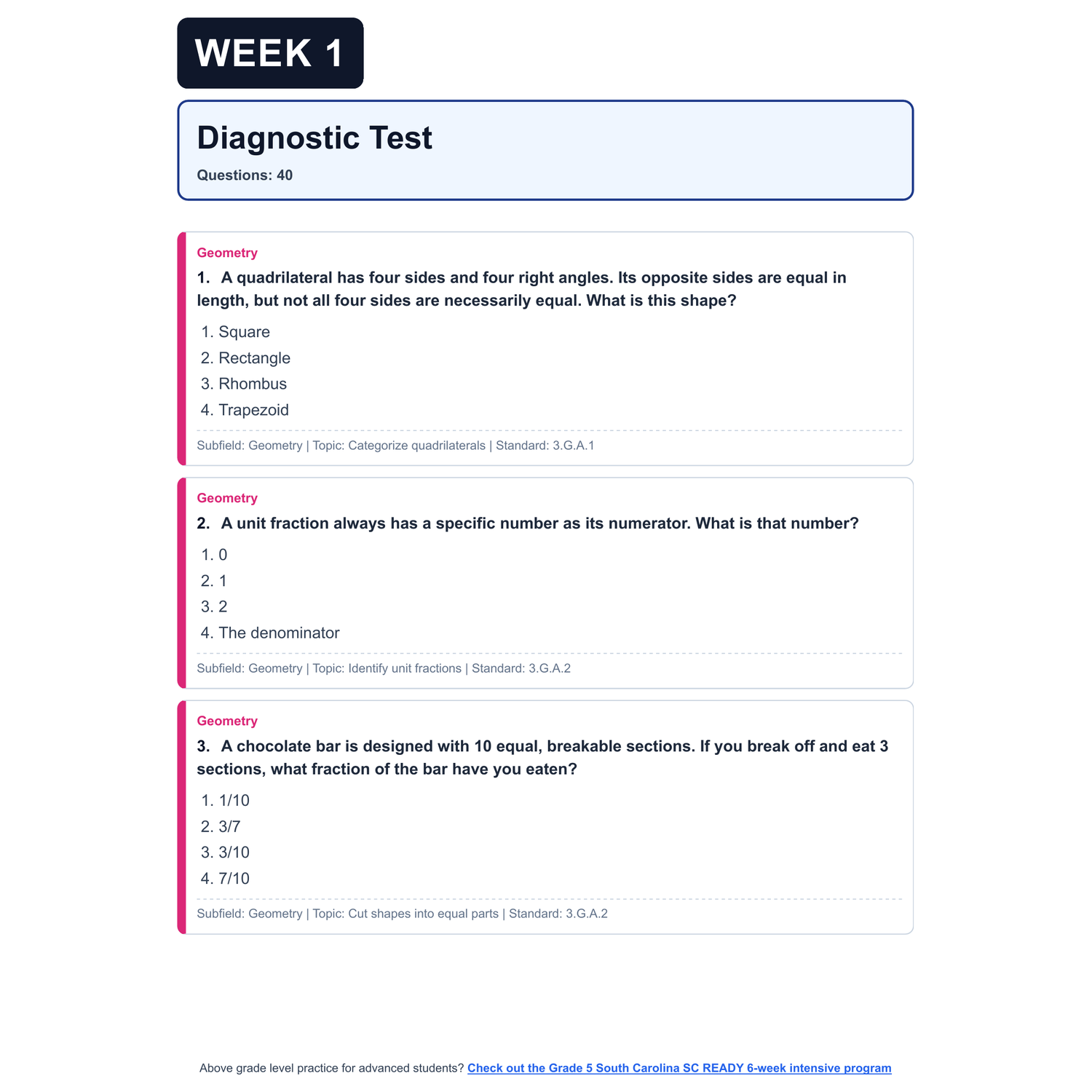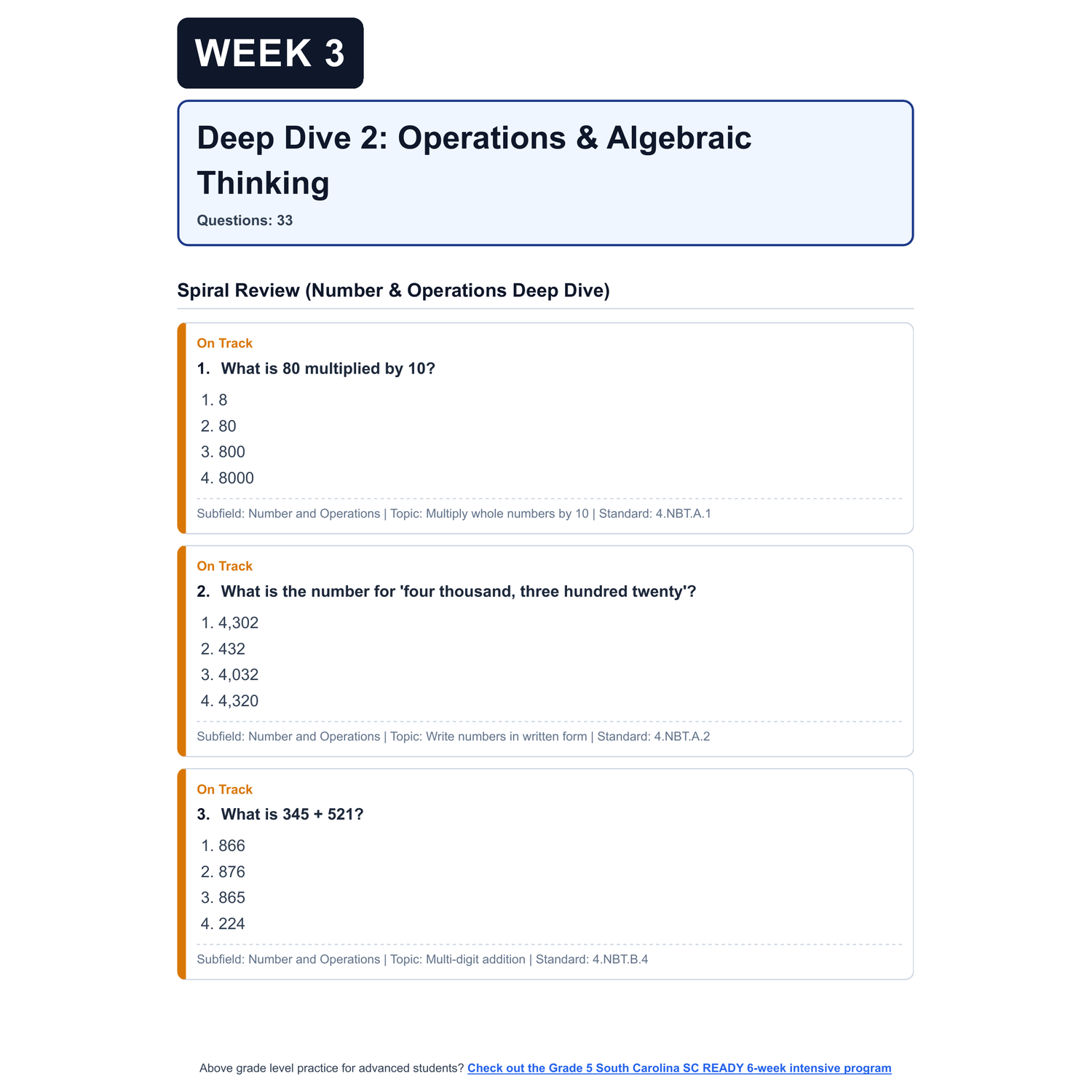 - 4 Targeted Domain Deep Dives: Each week focuses on one of the four test domains (Number | Algebra | Measurement, Data, and Statistics | Geometry). Each deep dive includes: targeted domain questions, a spiral review of previous weeks to ensure learned topics aren't forgotten, and clear question categorization by Scale Score and Common Core/South Carolina Math Standards (SCCCRS)