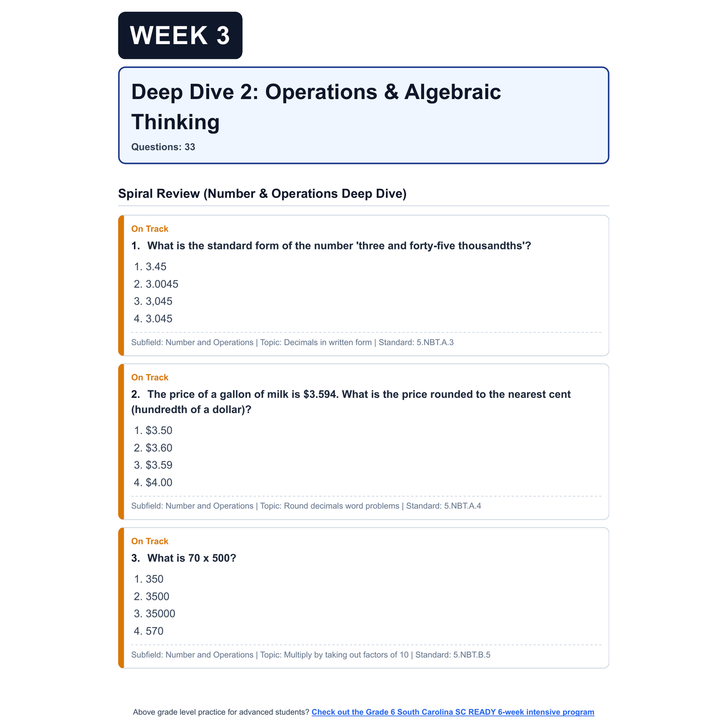 - 4 Targeted Domain Deep Dives: Each week focuses on one of the four test domains (Number | Algebra | Measurement, Data, and Statistics | Geometry). Each deep dive includes: targeted domain questions, a spiral review of previous weeks to ensure learned topics aren't forgotten, and clear question categorization by Scale Score and Common Core/South Carolina Math Standards (SCCCRS)