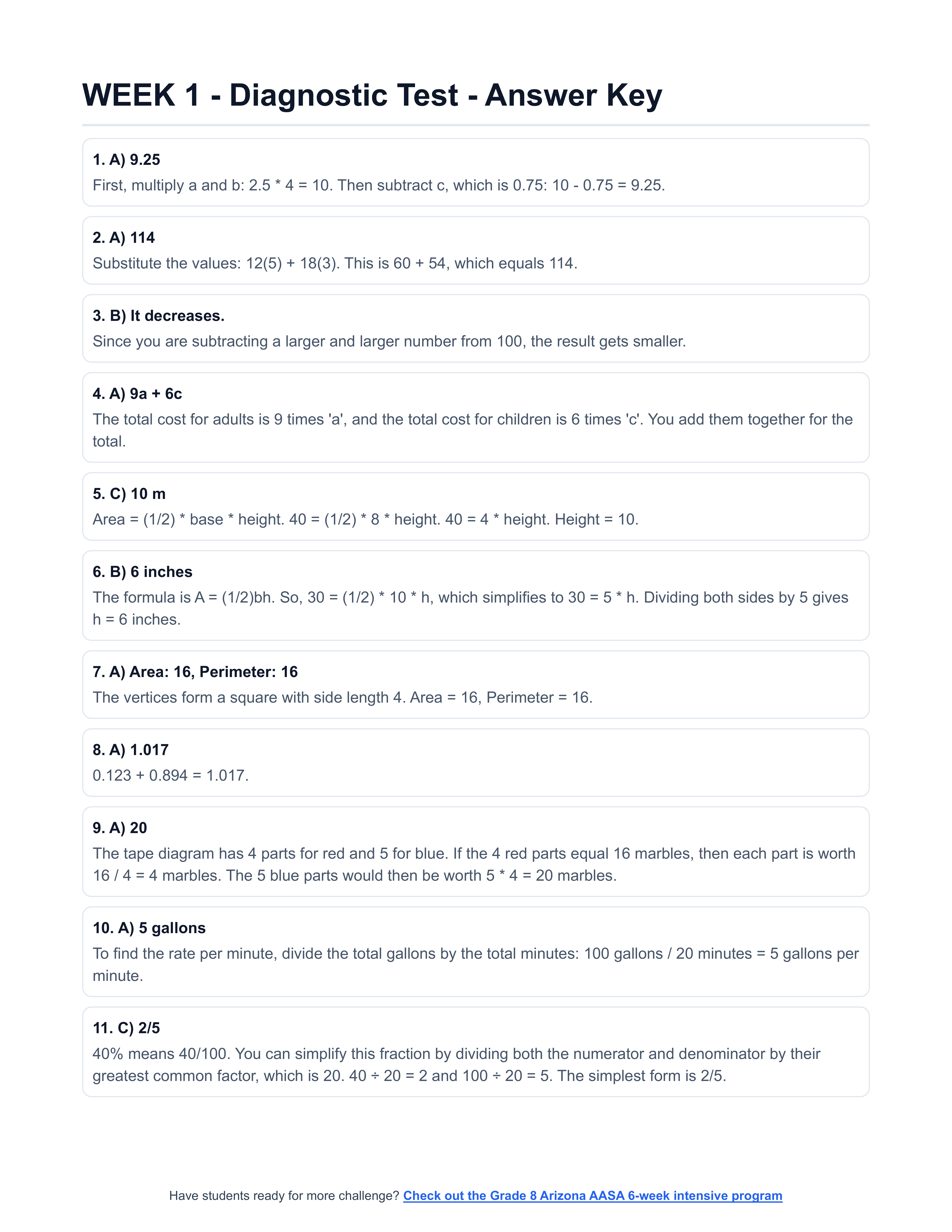 You get 3 complete, grade-specific intensive programs. Focusing on Arizona AASA prep is crucial because it allows for a pre-defined structured program. Having multiple grades allows you to place a student where they need to be, run group sessions, and retain students over time by moving them to the next grade. This is essentially your core print-and-go lesson plan. Each grade includes: