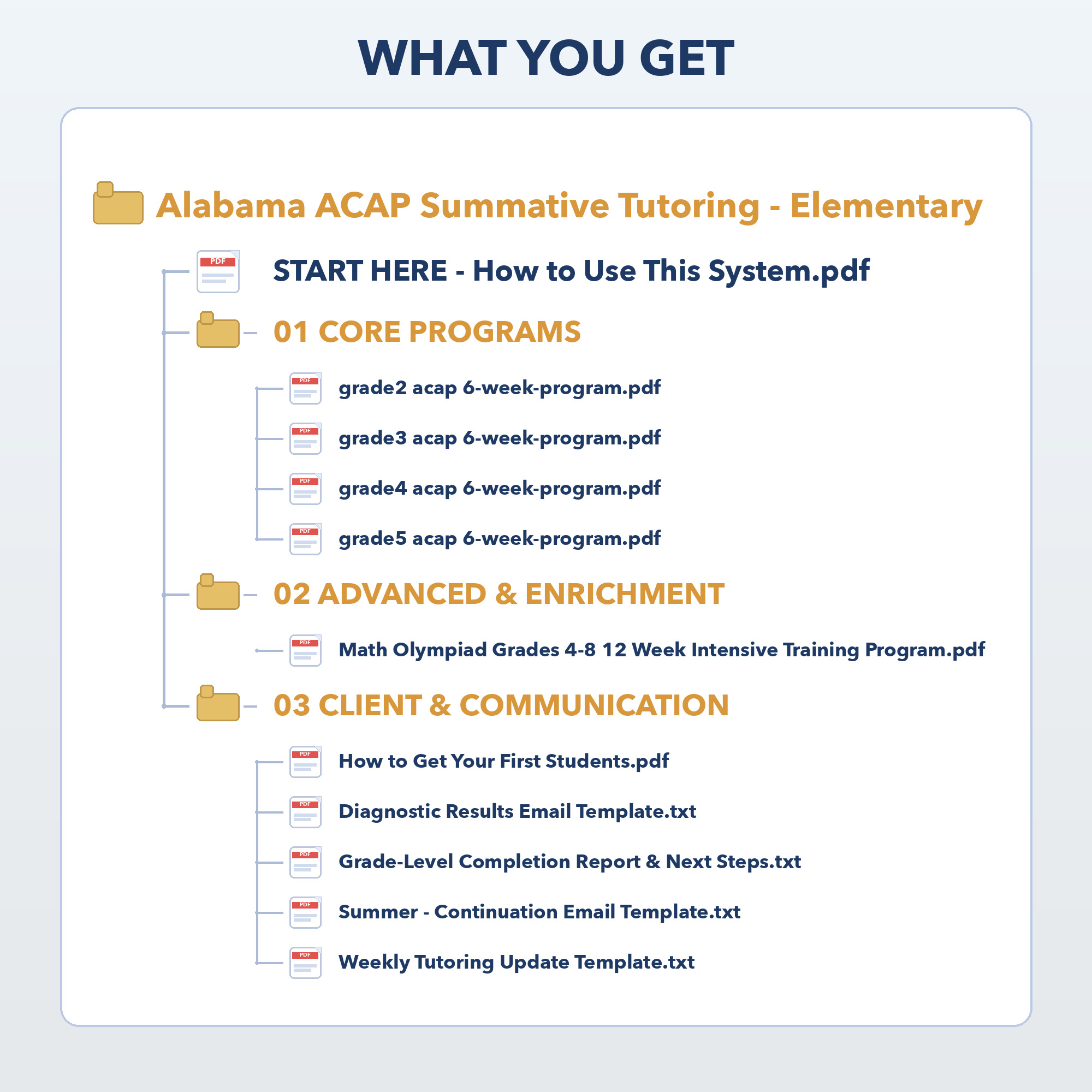 You get 4 complete, grade-specific intensive programs. Focusing on Alabama ACAP Summative prep is crucial because it allows for a pre-defined structured program. Having multiple grades allows you to place a student where they need to be, run group sessions, and retain students over time by moving them to the next grade. This is essentially your core print-and-go lesson plan. Each grade includes: