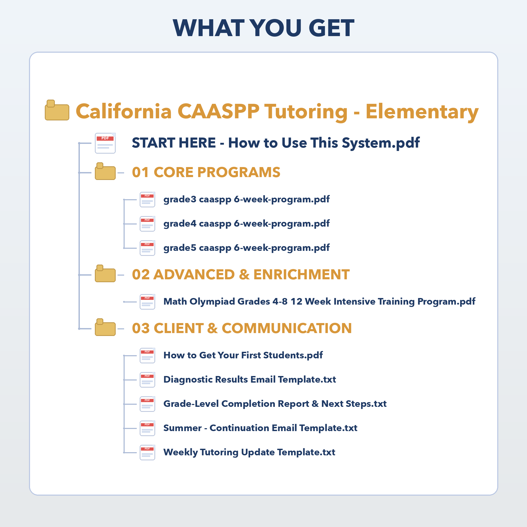 You get 3 complete, grade-specific intensive programs. Focusing on California CAASPP prep is crucial because it allows for a pre-defined structured program. Having multiple grades allows you to place a student where they need to be, run group sessions, and retain students over time by moving them to the next grade. This is essentially your core print-and-go lesson plan. Each grade includes: