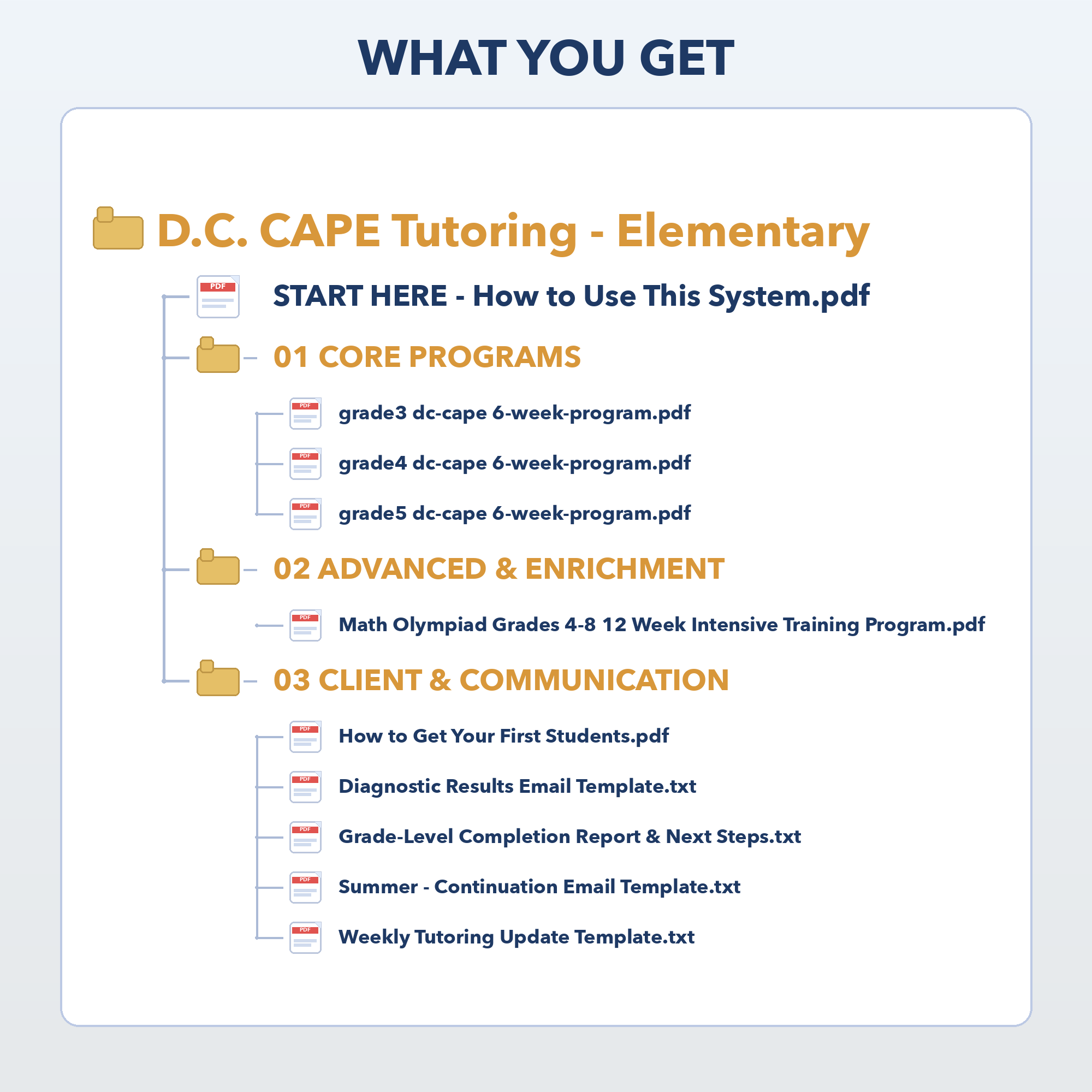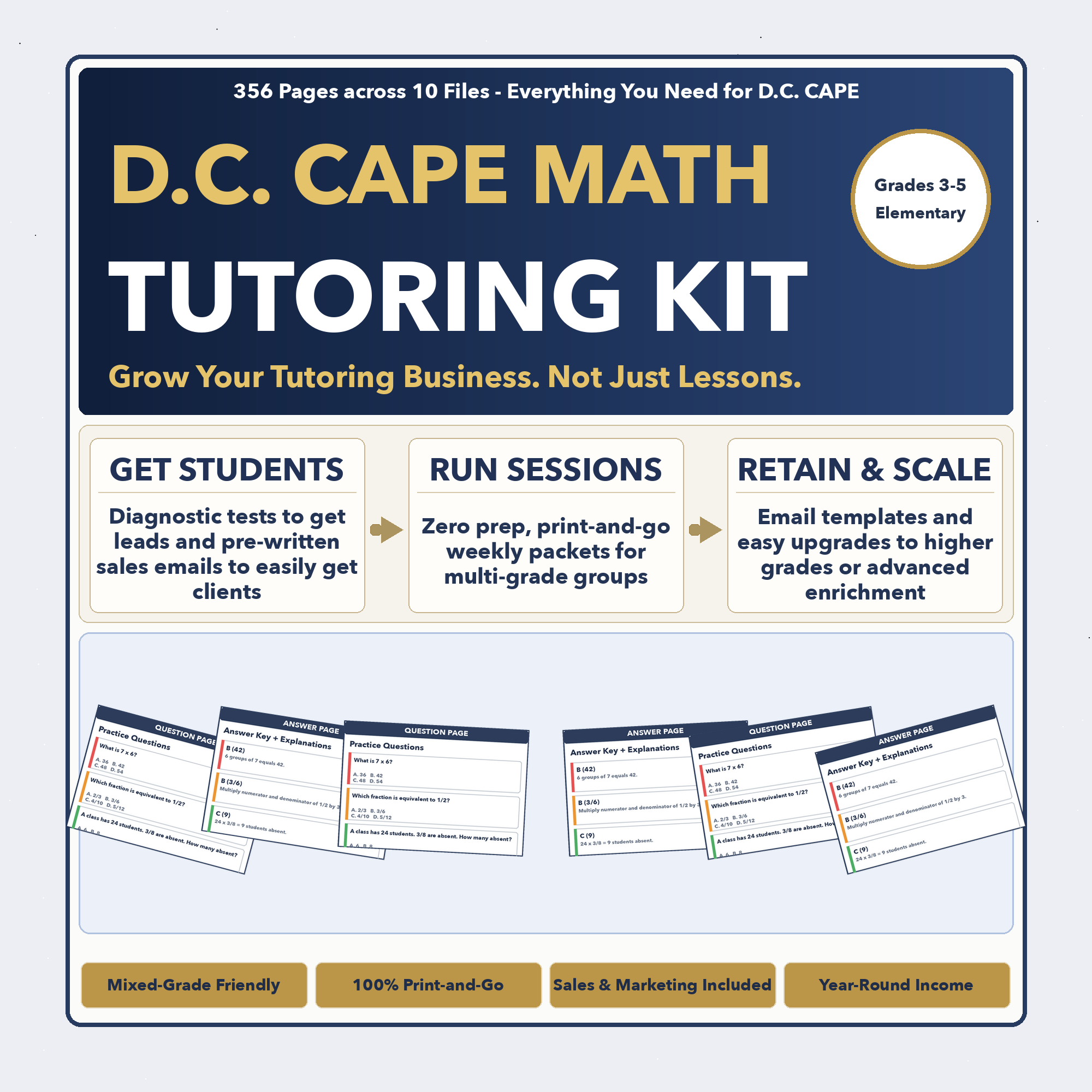 You get 3 complete, grade-specific intensive programs. Focusing on D.C. CAPE prep is crucial because it allows for a pre-defined structured program. Having multiple grades allows you to place a student where they need to be, run group sessions, and retain students over time by moving them to the next grade. This is essentially your core print-and-go lesson plan. Each grade includes: