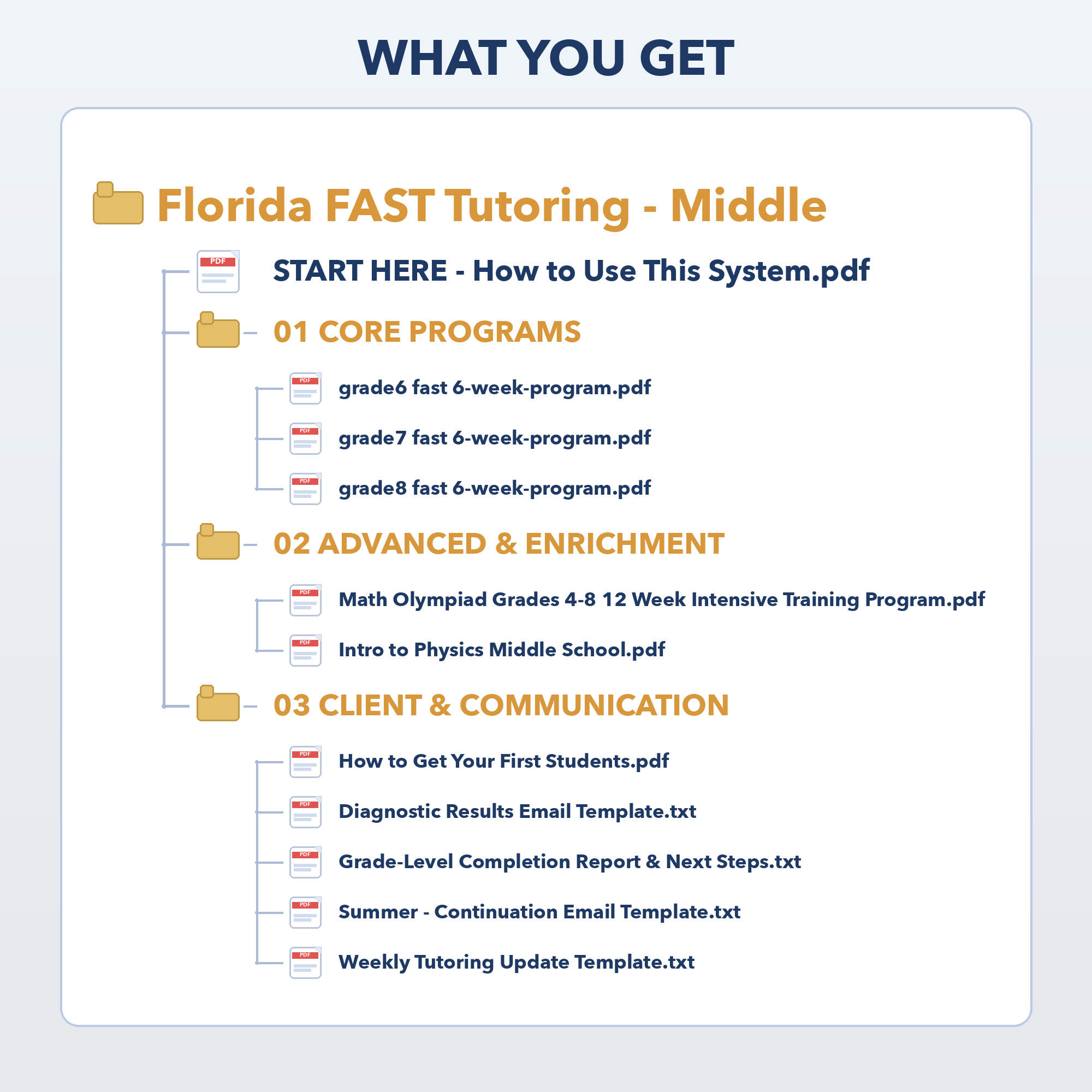 You get 3 complete, grade-specific intensive programs. Focusing on Florida FAST prep is crucial because it allows for a pre-defined structured program. Having multiple grades allows you to place a student where they need to be, run group sessions, and retain students over time by moving them to the next grade. This is essentially your core print-and-go lesson plan. Each grade includes: