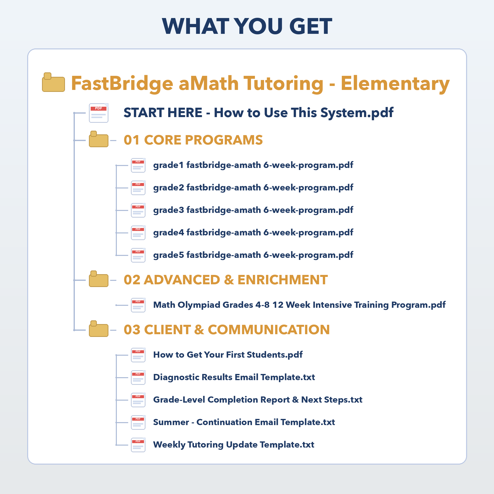 You get 5 complete, grade-specific intensive programs. Focusing on FastBridge aMath prep is crucial because it allows for a pre-defined structured program. Having multiple grades allows you to place a student where they need to be, run group sessions, and retain students over time by moving them to the next grade. This is essentially your core print-and-go lesson plan. Each grade includes: