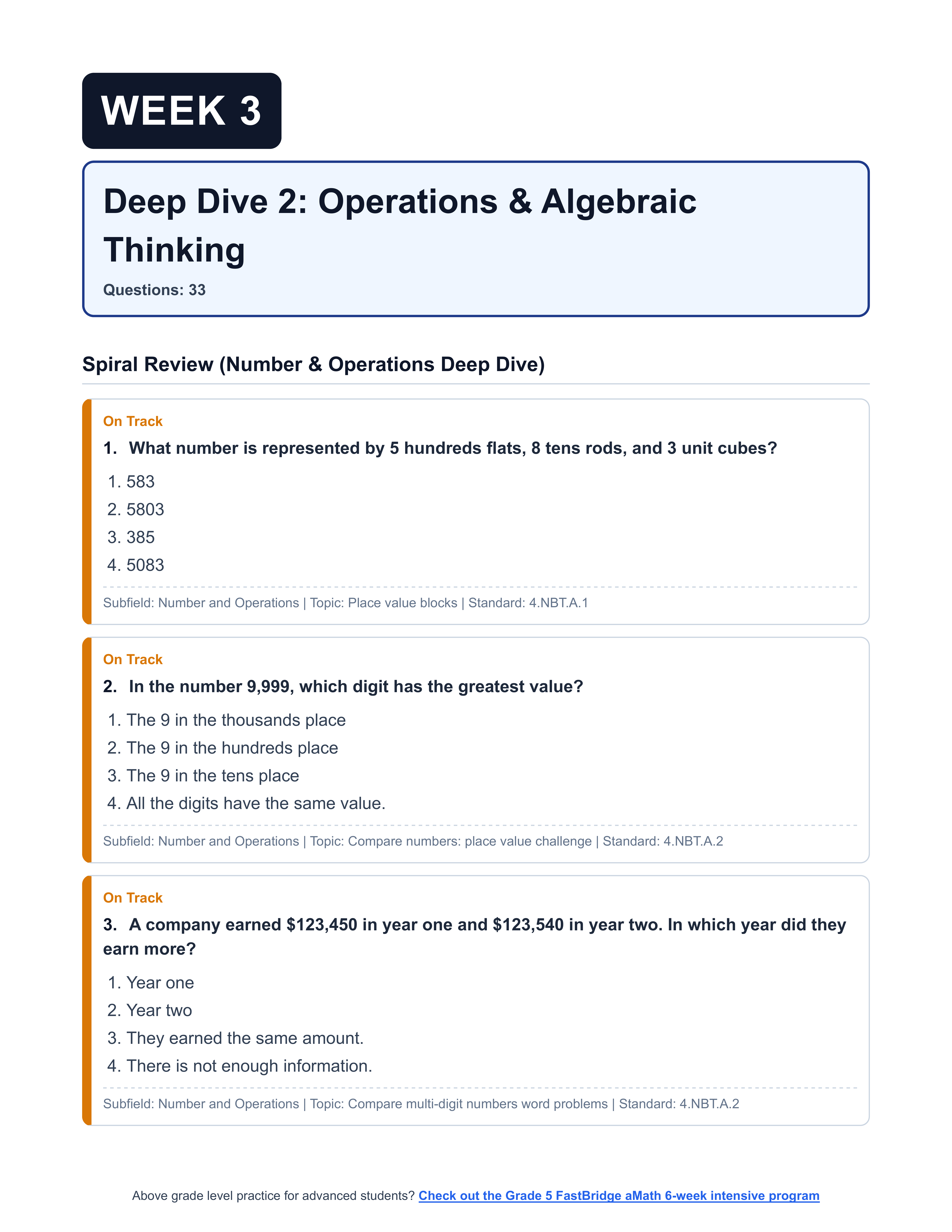 - 4 Targeted Domain Deep Dives: Weekly packets focused on specific domains, with spiral reviews so previous topics are not forgotten. Every single question is categorized by performance level and Scale Score band.
