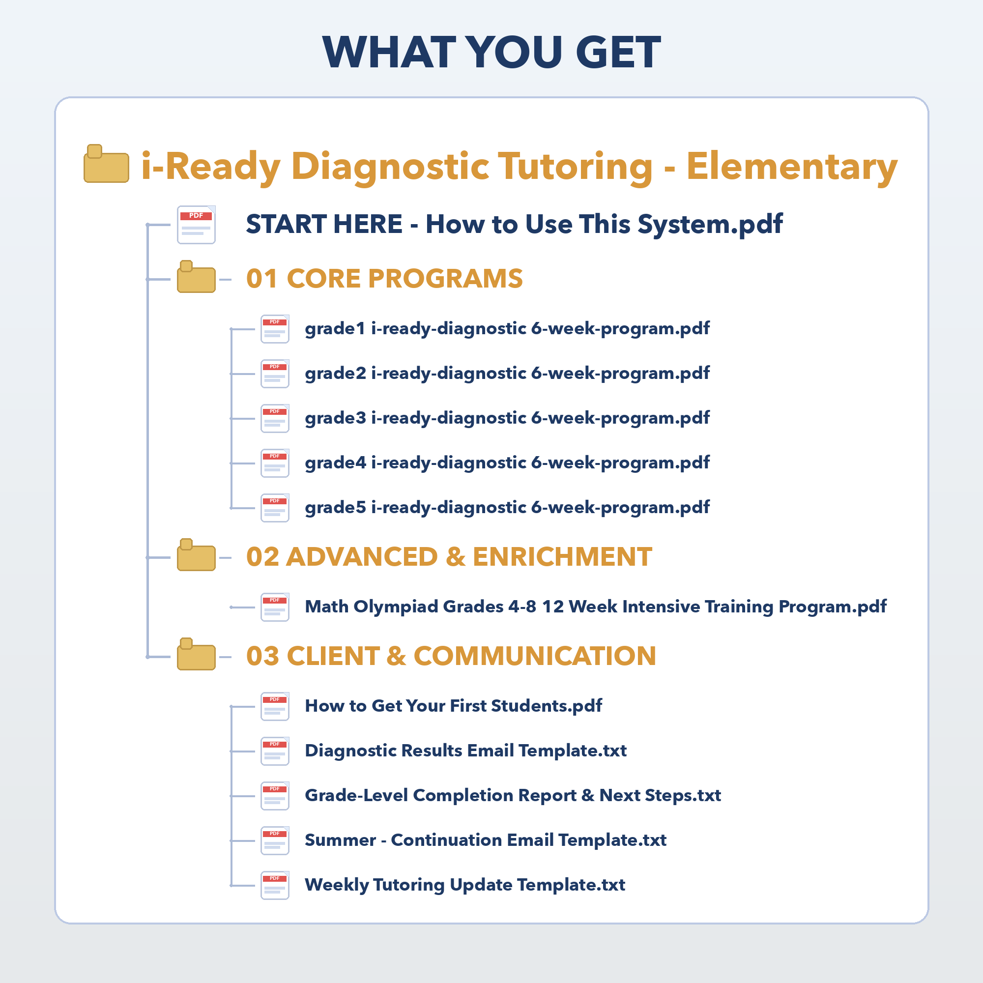 You get 5 complete, grade-specific intensive programs. Focusing on i-Ready Diagnostic prep is crucial because it allows for a pre-defined structured program. Having multiple grades allows you to place a student where they need to be, run group sessions, and retain students over time by moving them to the next grade. This is essentially your core print-and-go lesson plan. Each grade includes: