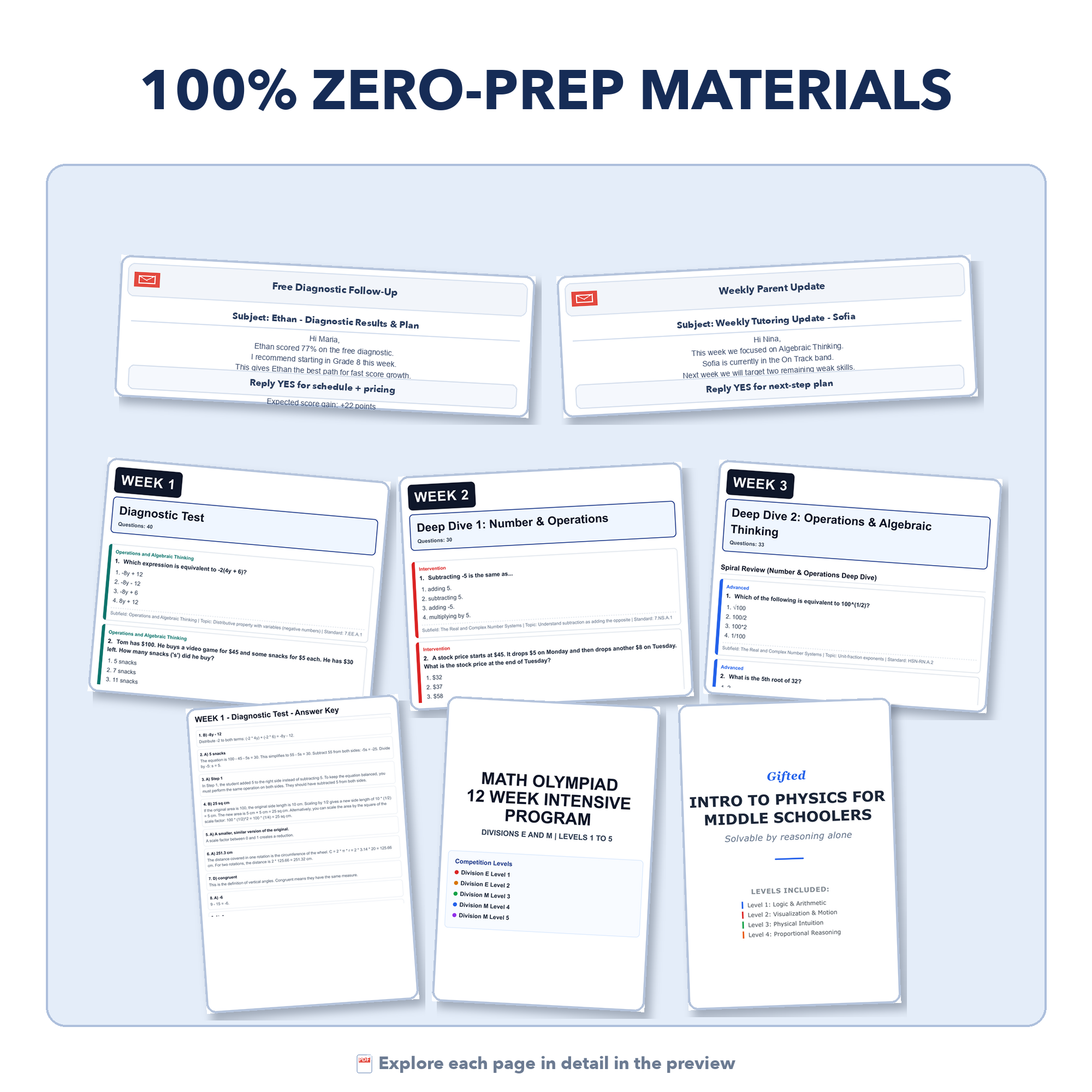 - Four email templates for parent communication: Simple, ready-to-use emails to share results, provide weekly updates, explain next steps, and guide parents toward continued tutoring in higher grades or the enrichment track.