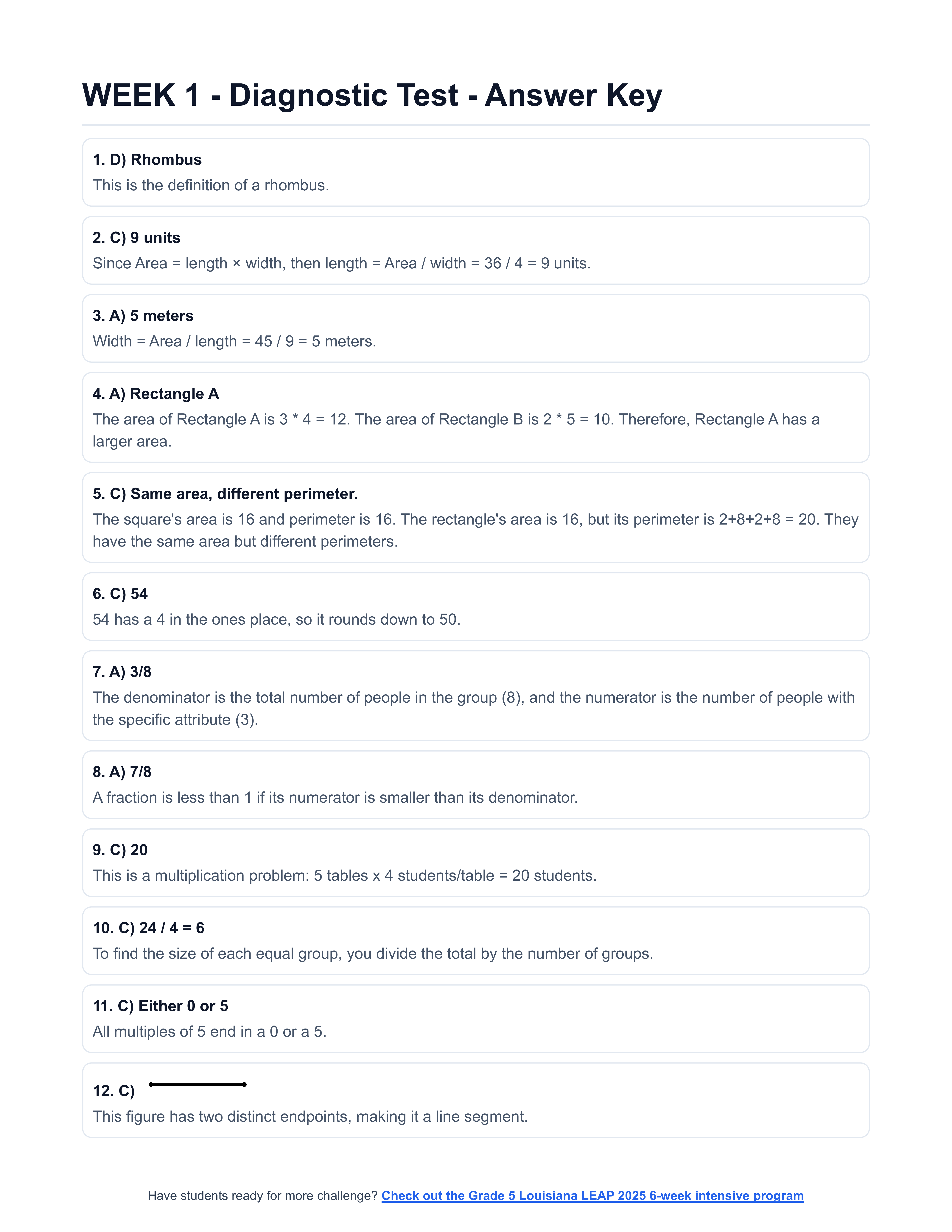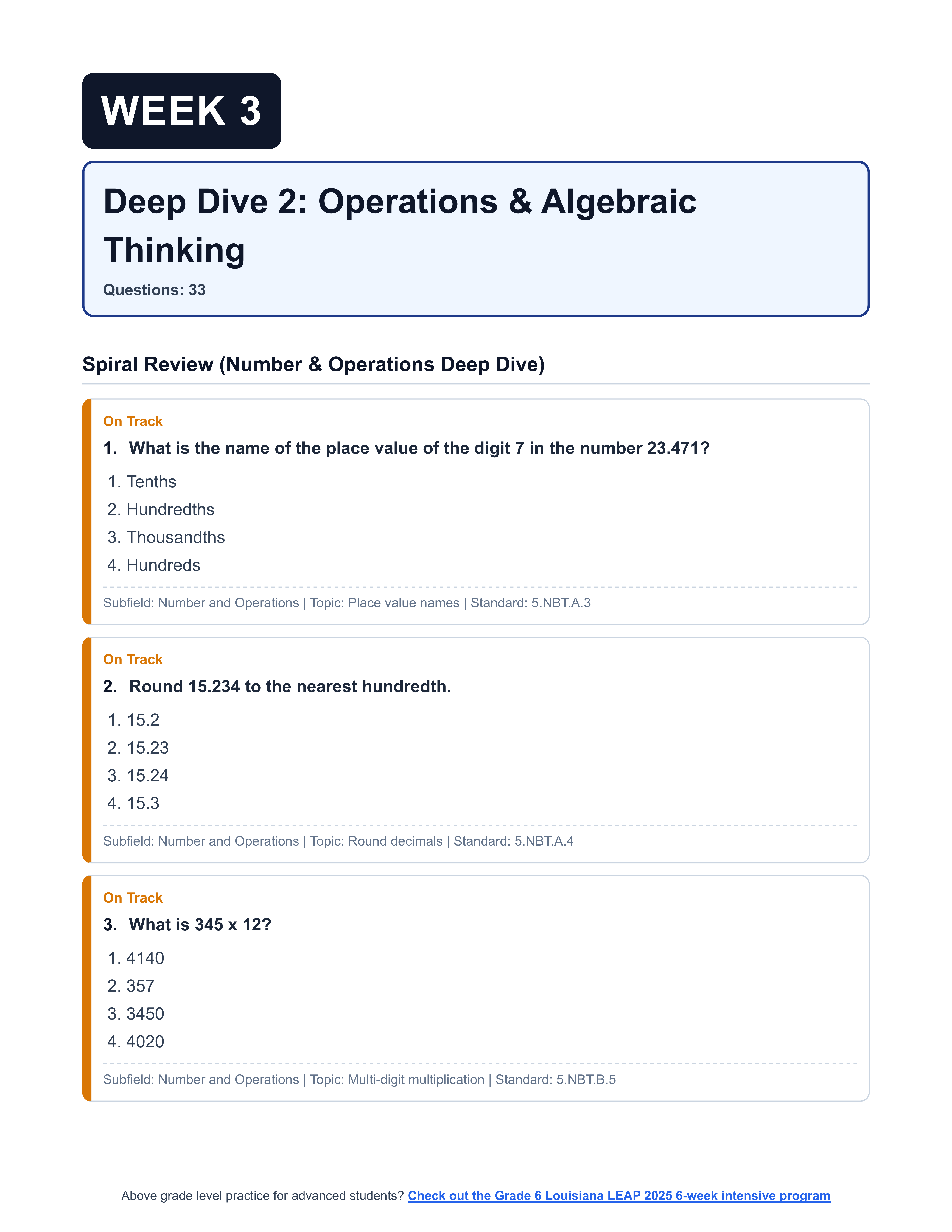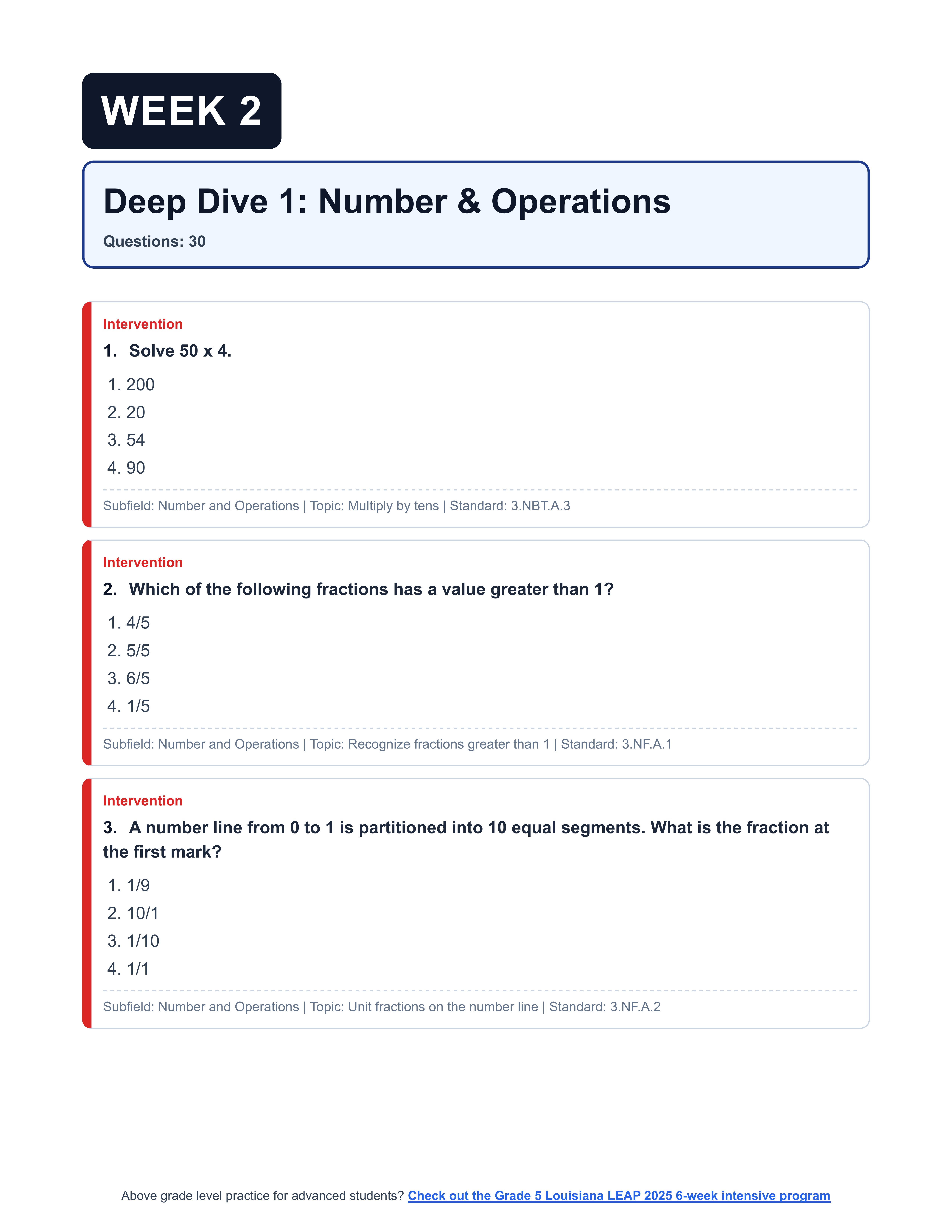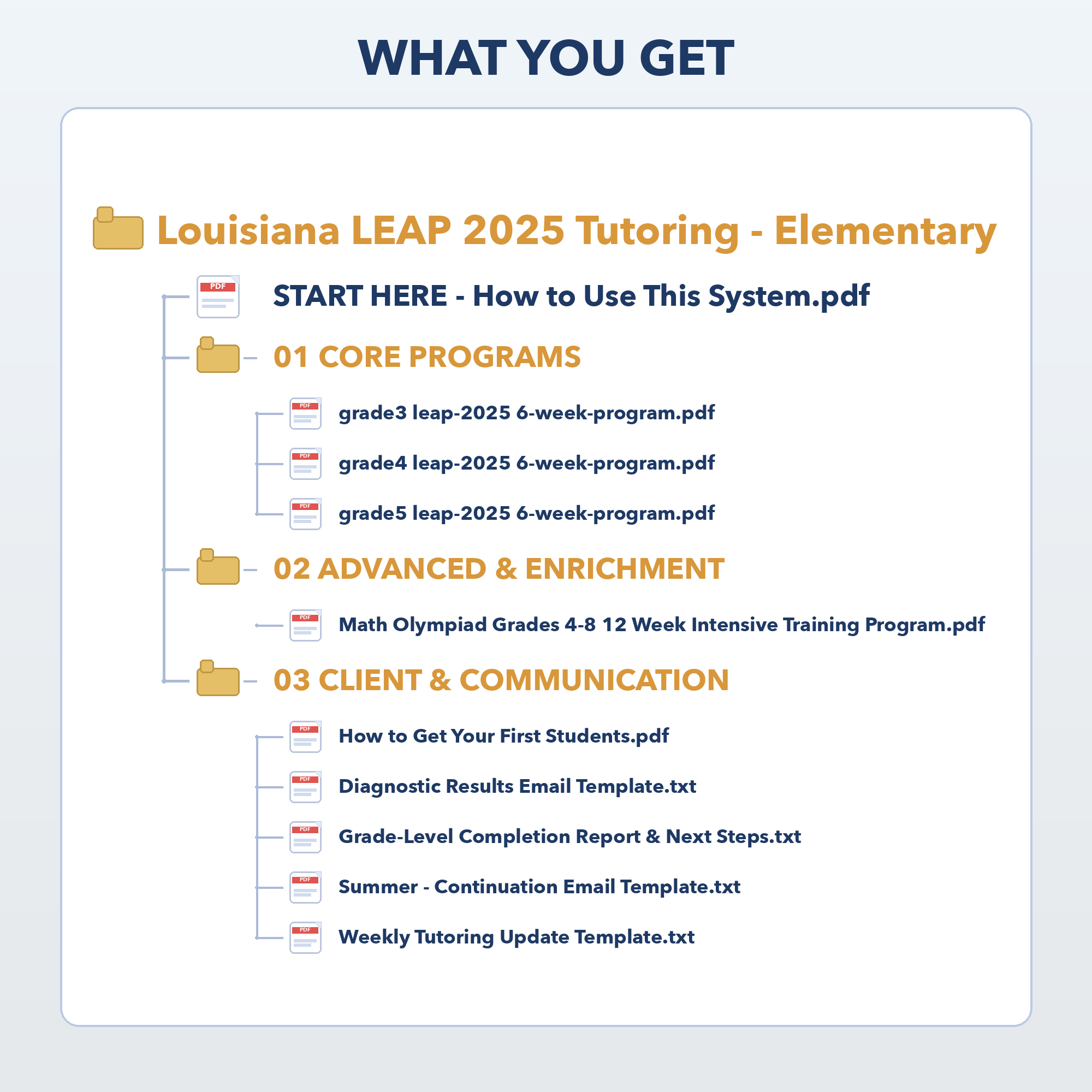 You get 3 complete, grade-specific intensive programs. Focusing on Louisiana LEAP 2025 prep is crucial because it allows for a pre-defined structured program. Having multiple grades allows you to place a student where they need to be, run group sessions, and retain students over time by moving them to the next grade. This is essentially your core print-and-go lesson plan. Each grade includes: