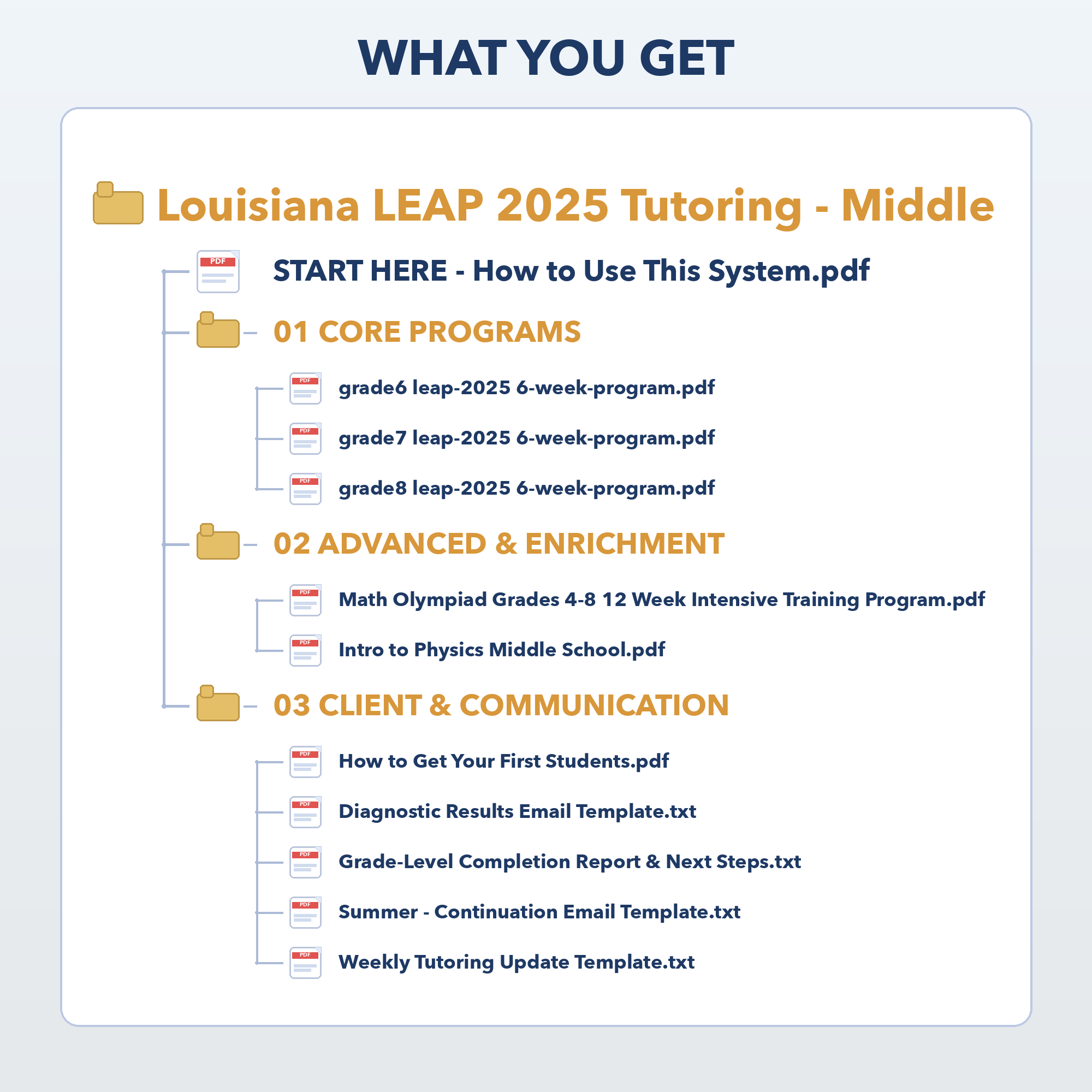 You get 3 complete, grade-specific intensive programs. Focusing on Louisiana LEAP 2025 prep is crucial because it allows for a pre-defined structured program. Having multiple grades allows you to place a student where they need to be, run group sessions, and retain students over time by moving them to the next grade. This is essentially your core print-and-go lesson plan. Each grade includes: