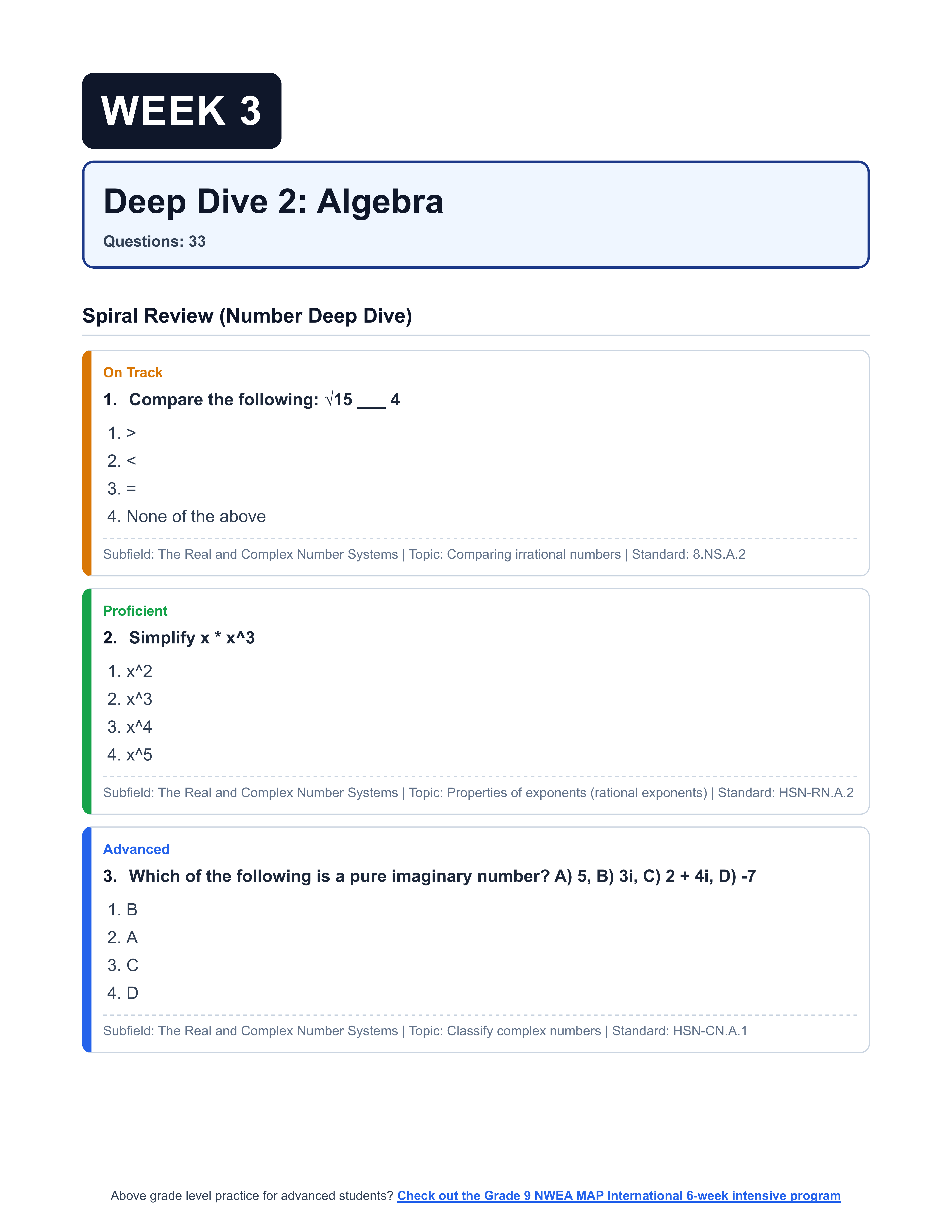- 4 Targeted Domain Deep Dives: Weekly packets focused on specific domains, with spiral reviews so previous topics are not forgotten. Every single question is categorized by performance level and RIT band.