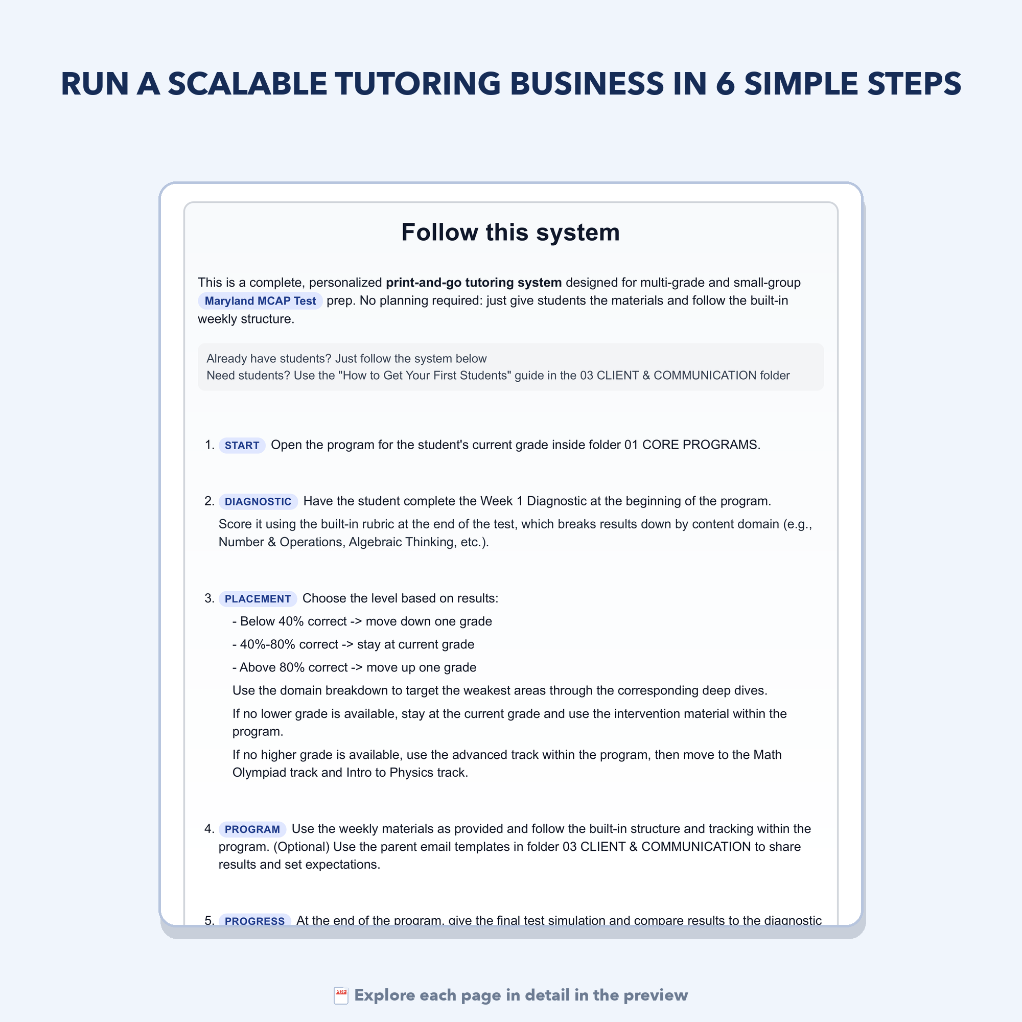 - "How to Get Your First Students" Guide: A step-by-step funnel showing you exactly how to organize a free Week 1 Diagnostic to get clients and then convert them. Provide value first, then upsell your services.