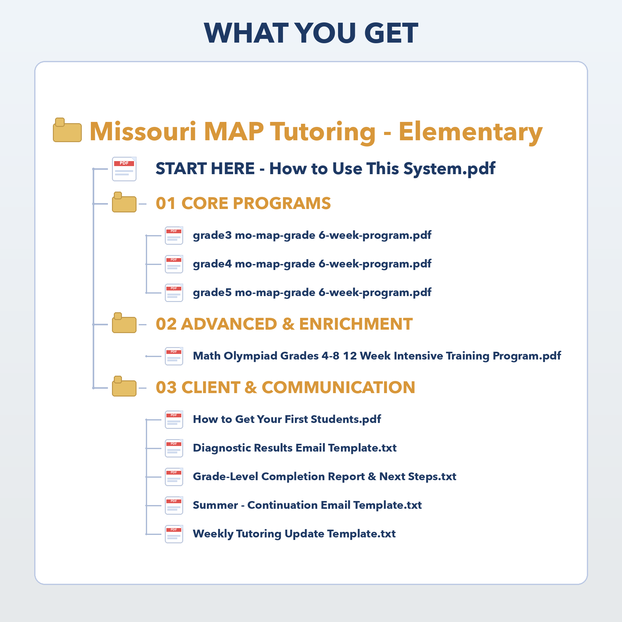 You get 3 complete, grade-specific intensive programs. Focusing on Missouri MAP prep is crucial because it allows for a pre-defined structured program. Having multiple grades allows you to place a student where they need to be, run group sessions, and retain students over time by moving them to the next grade. This is essentially your core print-and-go lesson plan. Each grade includes: