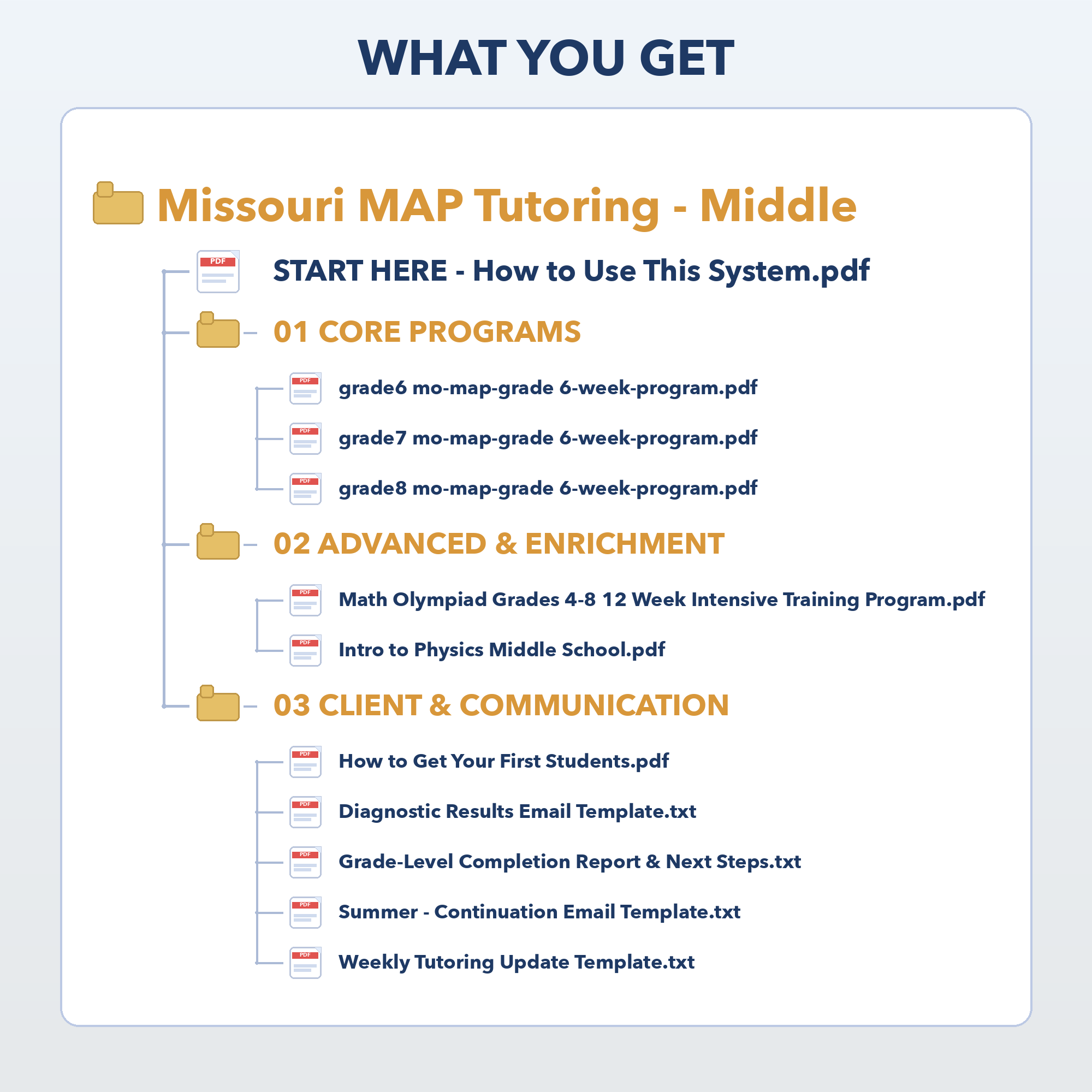 You get 3 complete, grade-specific intensive programs. Focusing on Missouri MAP prep is crucial because it allows for a pre-defined structured program. Having multiple grades allows you to place a student where they need to be, run group sessions, and retain students over time by moving them to the next grade. This is essentially your core print-and-go lesson plan. Each grade includes: