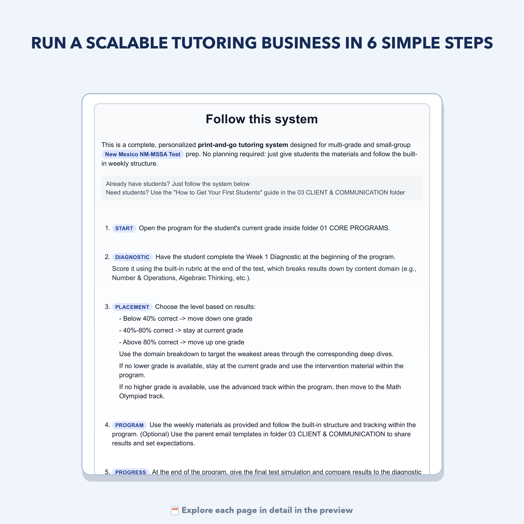 - Four email templates for parent communication: Simple, ready-to-use emails to share results, provide weekly updates, explain next steps, and guide parents toward continued tutoring in higher grades or the enrichment track.