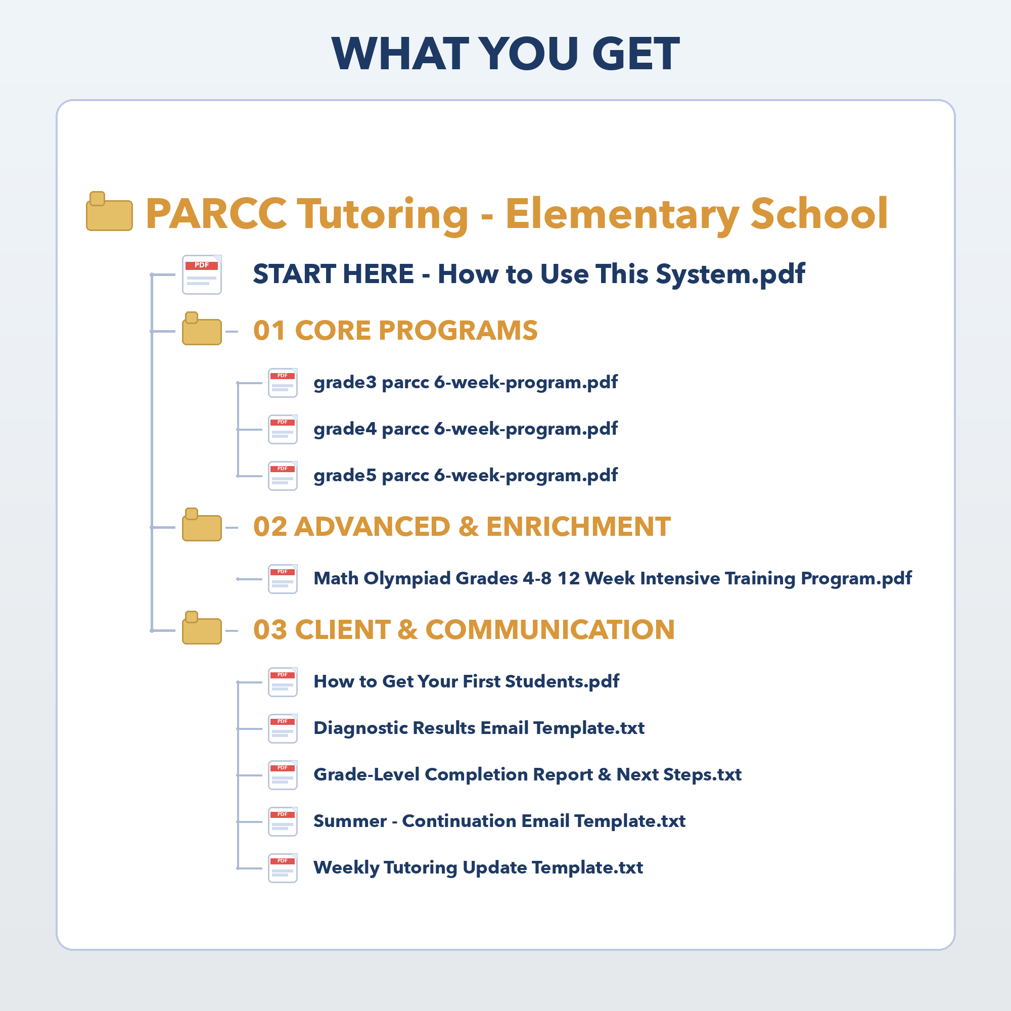 You get 3 complete, grade-specific intensive programs. Focusing on PARCC prep is crucial because it allows for a pre-defined structured program. Having multiple grades allows you to place a student where they need to be, run group sessions, and retain students over time by moving them to the next grade. This is essentially your core print-and-go lesson plan. Each grade includes:
