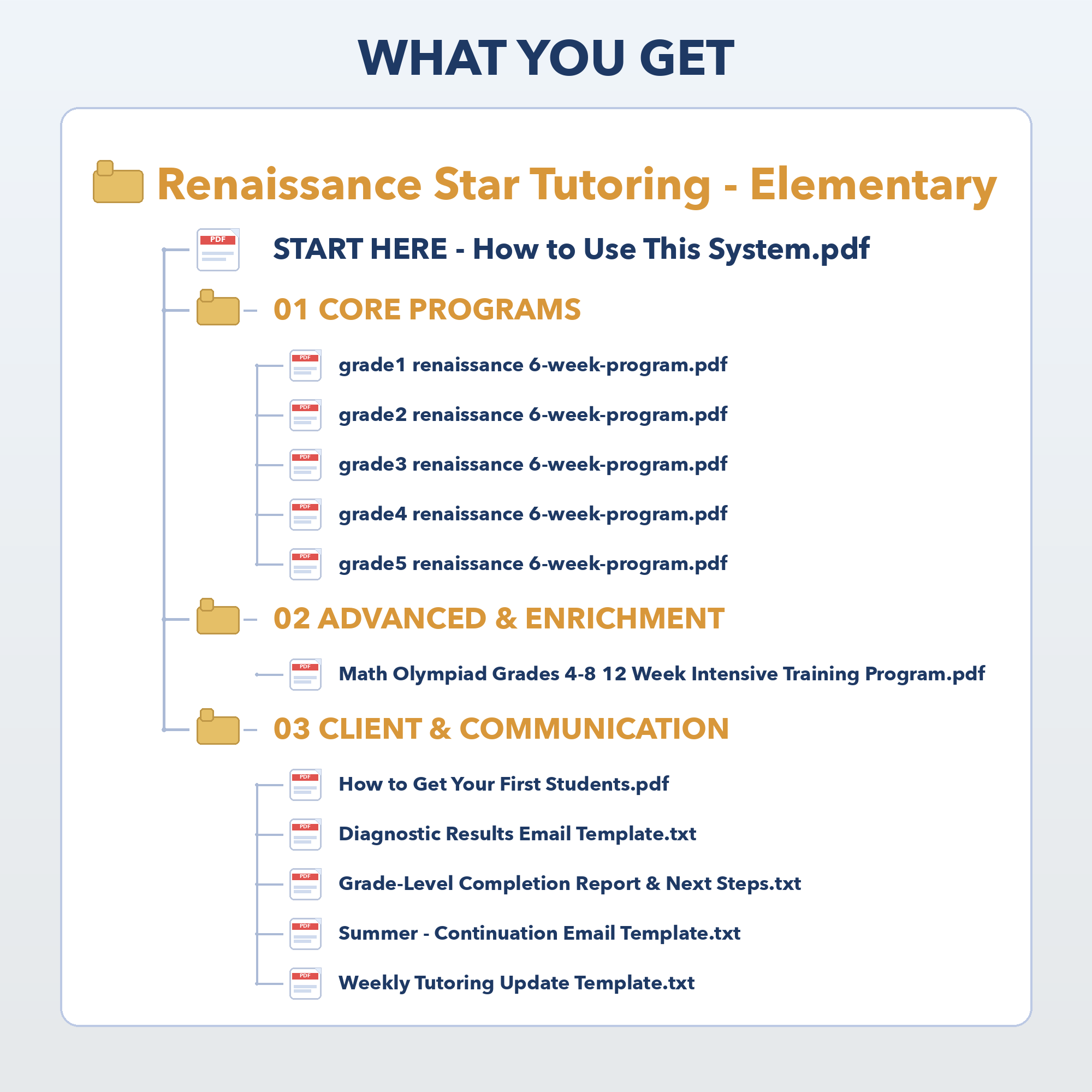 You get 5 complete, grade-specific intensive programs. Focusing on Renaissance Star prep is crucial because it allows for a pre-defined structured program. Having multiple grades allows you to place a student where they need to be, run group sessions, and retain students over time by moving them to the next grade. This is essentially your core print-and-go lesson plan. Each grade includes: