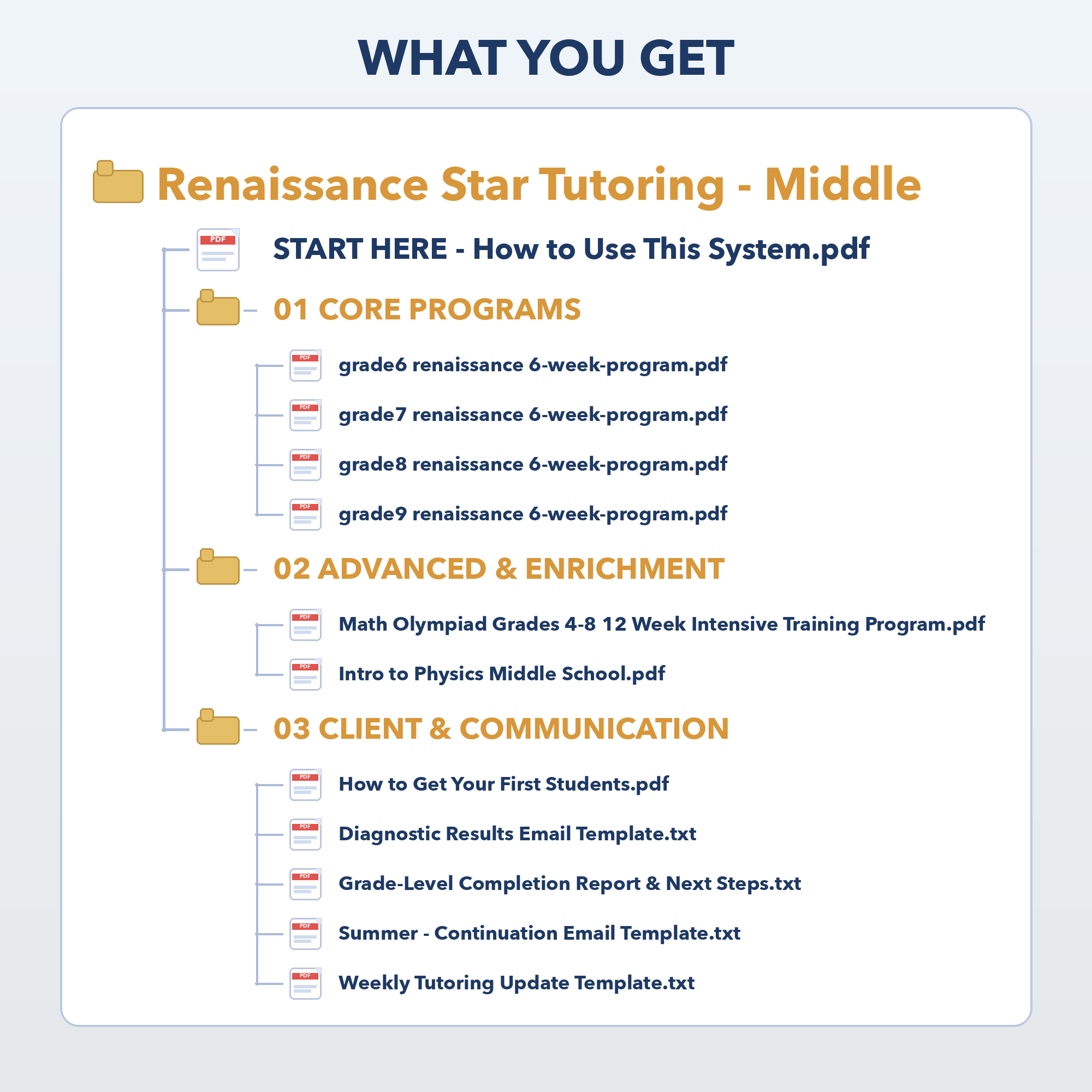 You get 4 complete, grade-specific intensive programs. Focusing on Renaissance Star prep is crucial because it allows for a pre-defined structured program. Having multiple grades allows you to place a student where they need to be, run group sessions, and retain students over time by moving them to the next grade. This is essentially your core print-and-go lesson plan. Each grade includes: