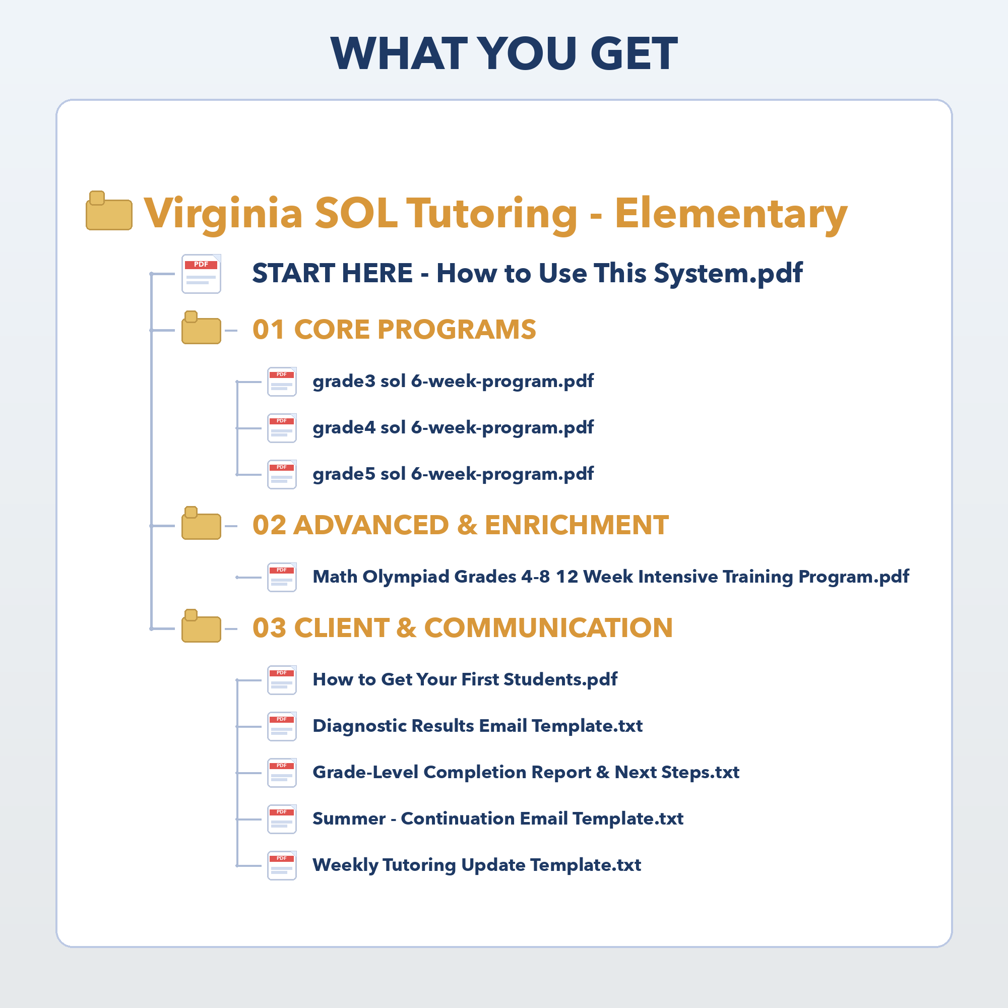 You get 3 complete, grade-specific intensive programs. Focusing on Virginia SOL prep is crucial because it allows for a pre-defined structured program. Having multiple grades allows you to place a student where they need to be, run group sessions, and retain students over time by moving them to the next grade. This is essentially your core print-and-go lesson plan. Each grade includes: