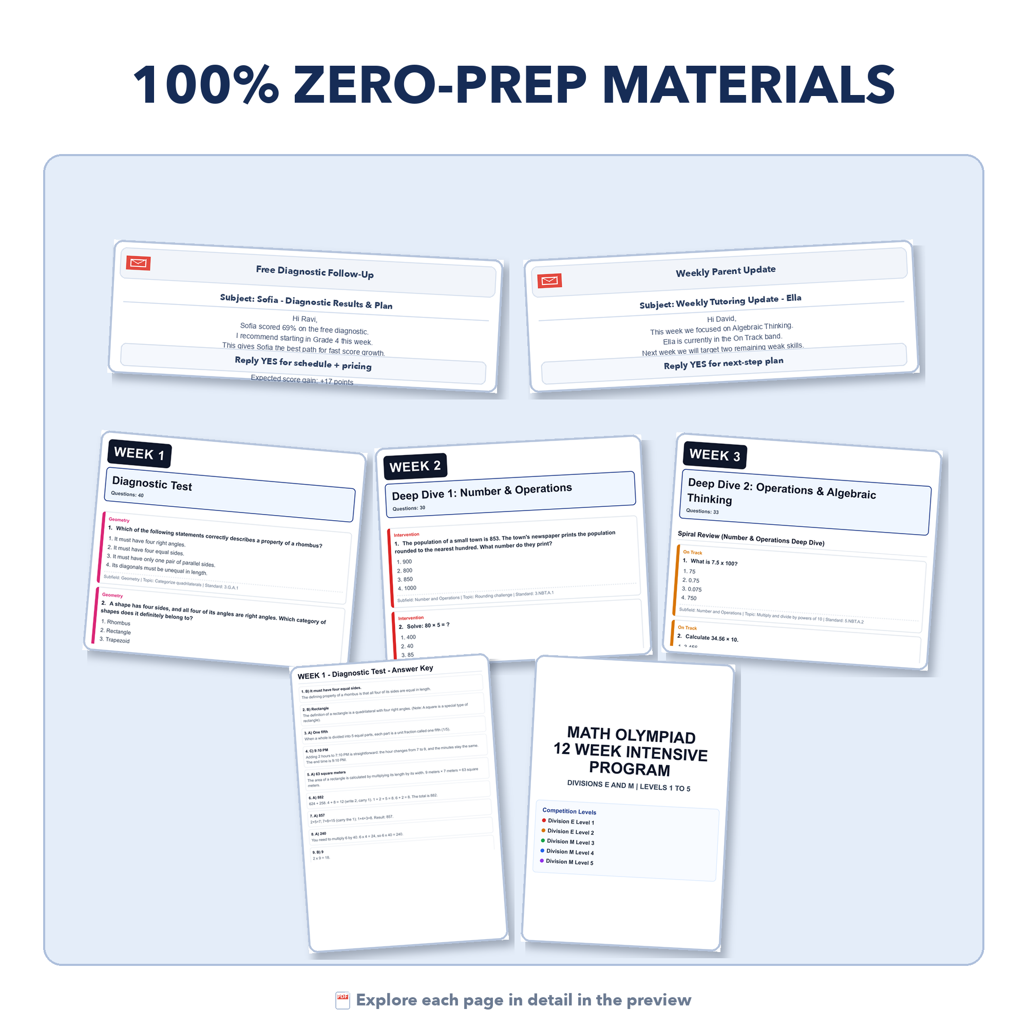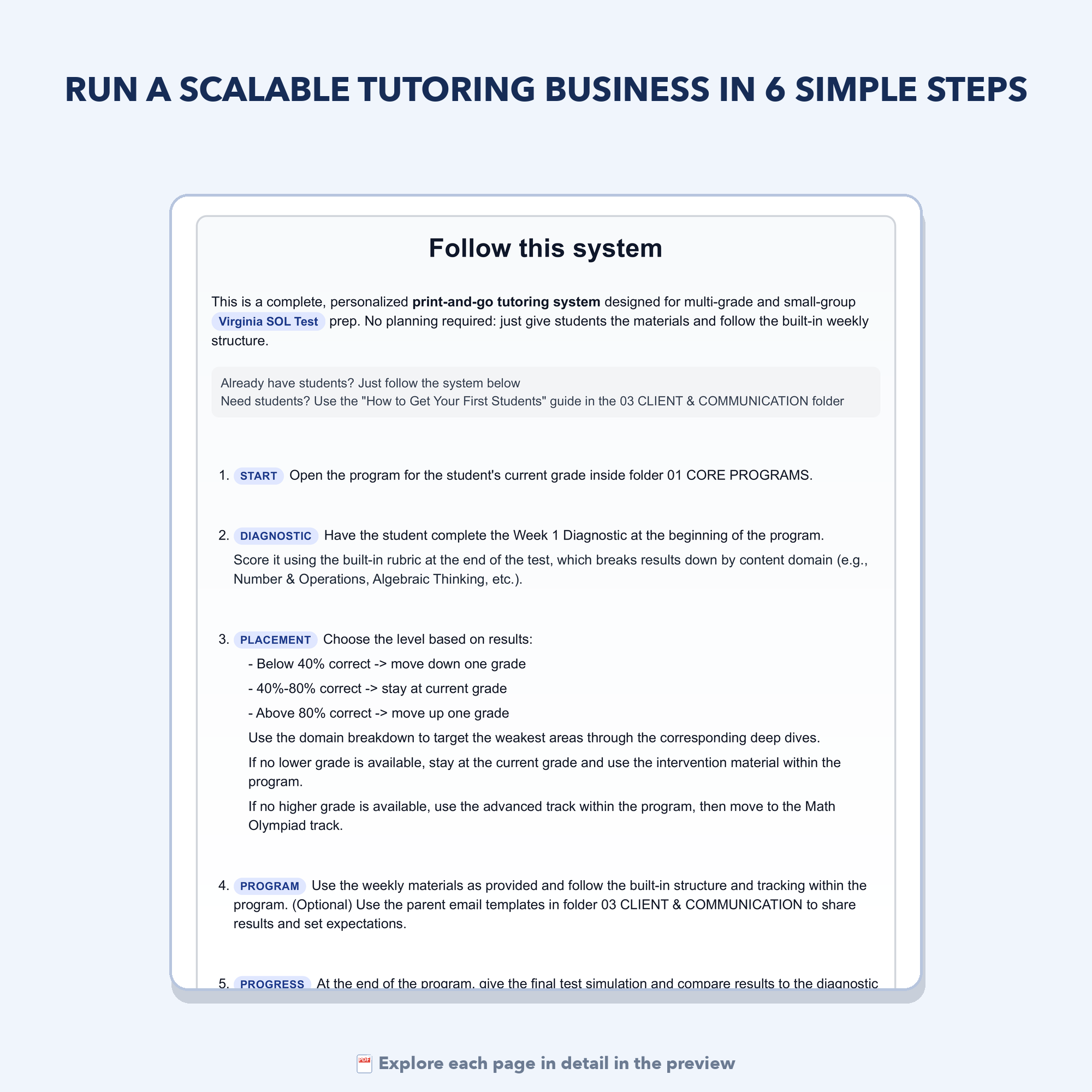 - Four email templates for parent communication: Simple, ready-to-use emails to share results, provide weekly updates, explain next steps, and guide parents toward continued tutoring in higher grades or the enrichment track.