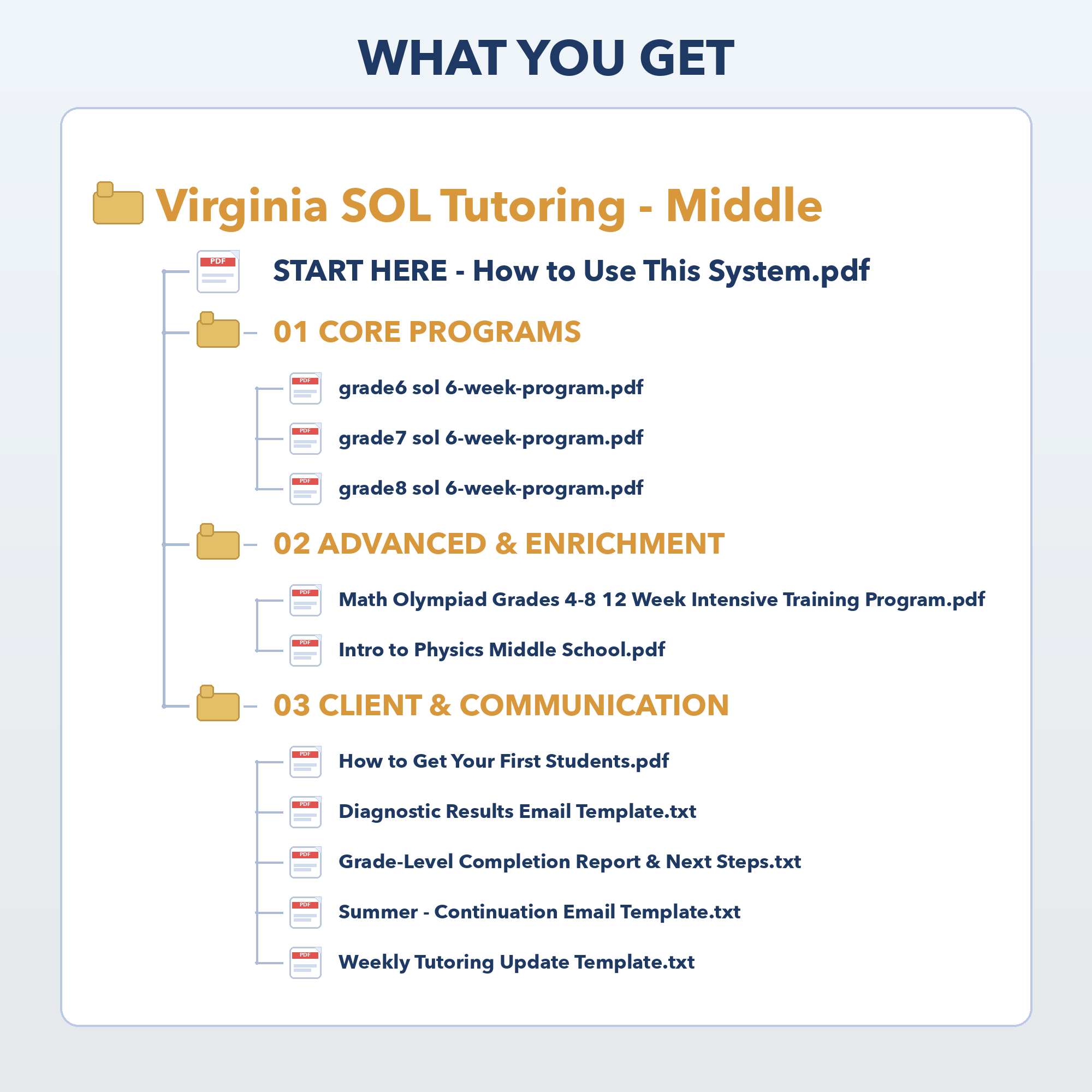 You get 3 complete, grade-specific intensive programs. Focusing on Virginia SOL prep is crucial because it allows for a pre-defined structured program. Having multiple grades allows you to place a student where they need to be, run group sessions, and retain students over time by moving them to the next grade. This is essentially your core print-and-go lesson plan. Each grade includes: