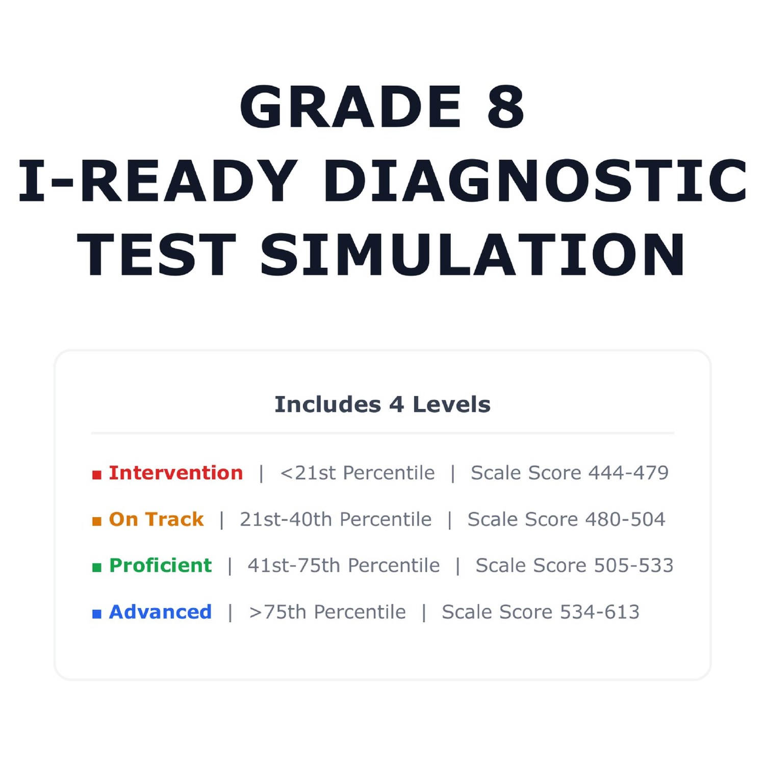 A fun and effective way to prepare 8th graders for the i-Ready Diagnostic Mathematics standardized test. This resource makes it very easy to identify each student level and maximize growth and test scores. It’s designed to be used as a traditional practice test or as a fun board game to keep your students engaged.