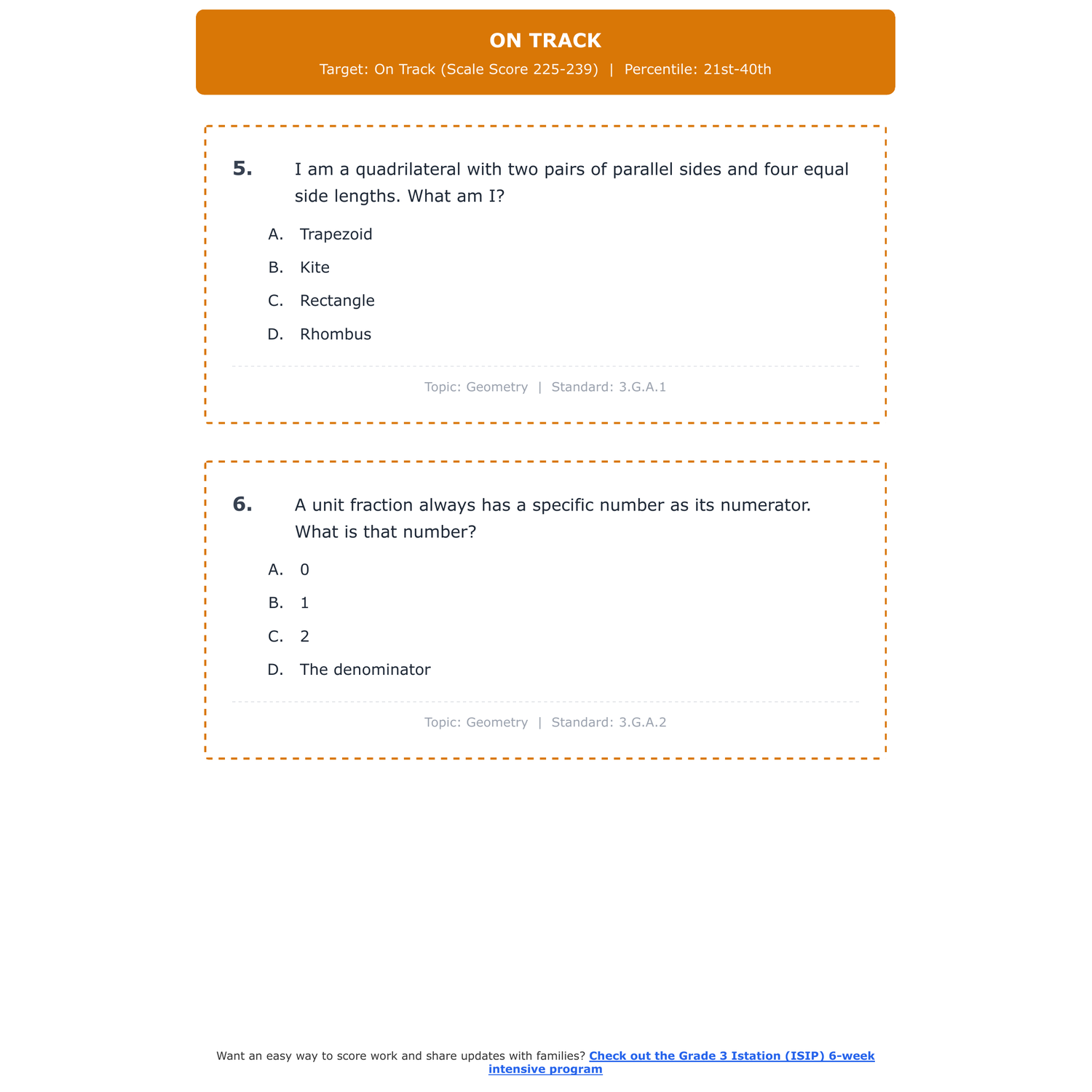 - A PDF with 40 unique math questions inspired by the Istation (ISIP) test